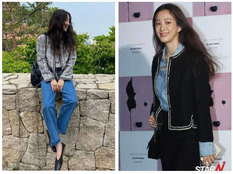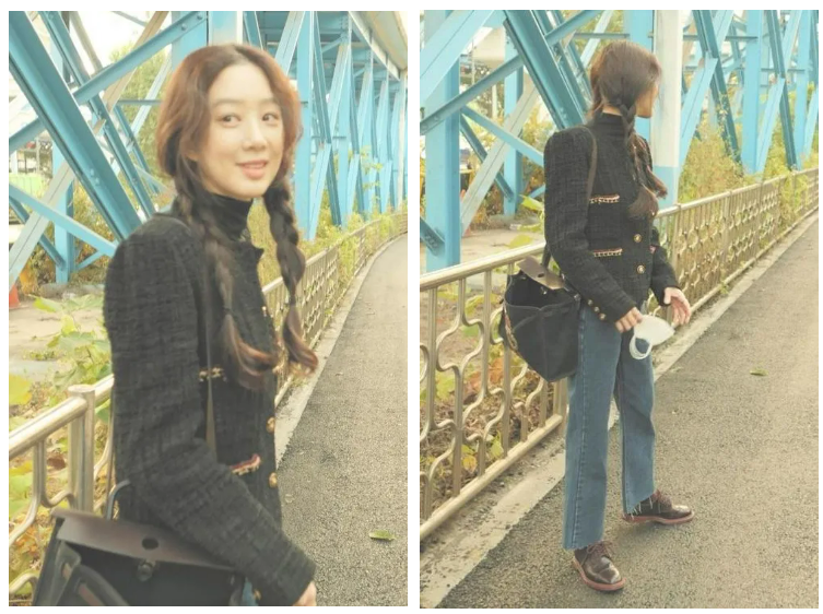 另一个我觉得有郑丽媛特色的单品是粗花呢外套!而且甚至还是圆领的!其实圆领粗花呢外套总会有点名媛感,她的解腻思路也很简单,就是毛躁头发+牛仔!