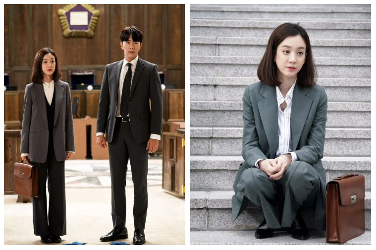 在《魔女的法庭》中她有很多的西装look,但这种肩线合身+版型偏长的西装,就更衬得她头大肩窄,像个豆芽菜。也完全没有了168cm该有的气场。