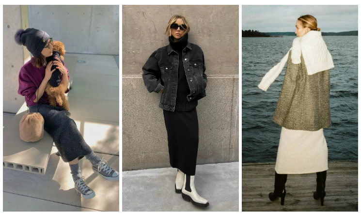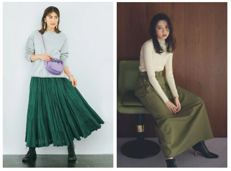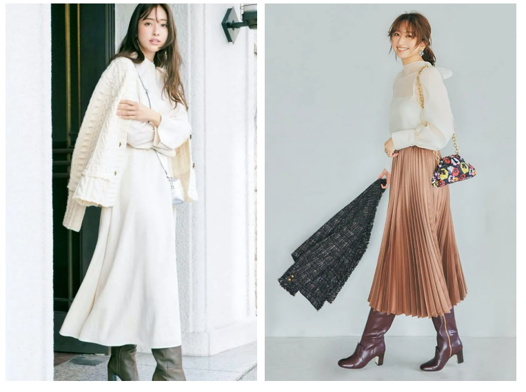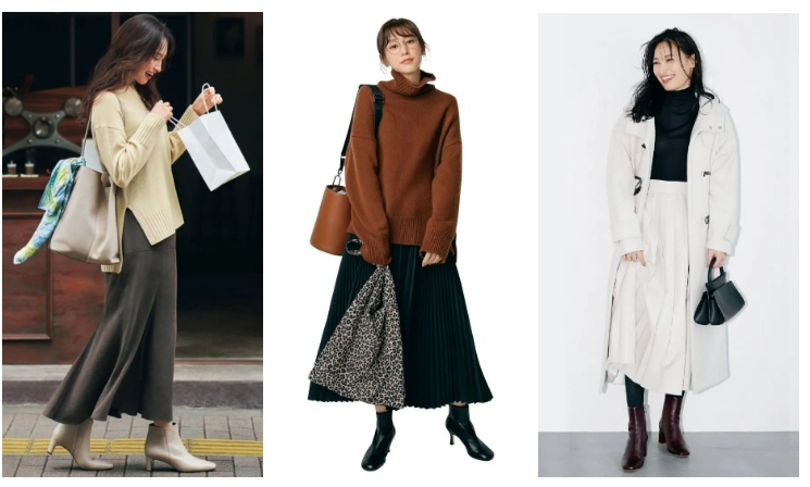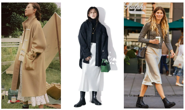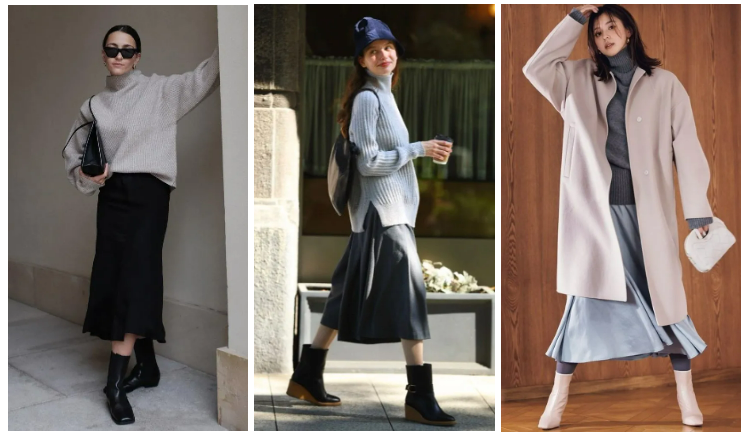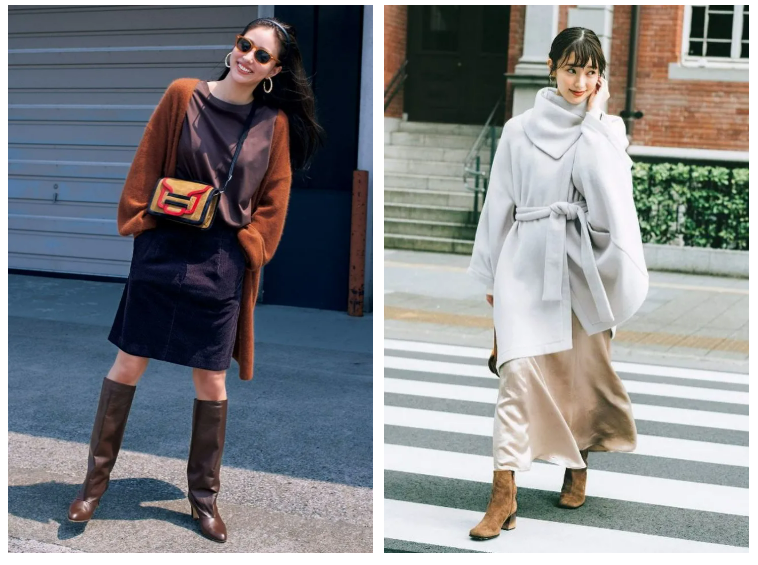 穿中长裙时,因为裙长卡在小腿肚附近,如果搭短靴,会显得腿又短又壮;搭中长靴又容易刚好碰到裙摆,走动时也会有把腿分截的效果。
