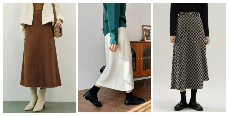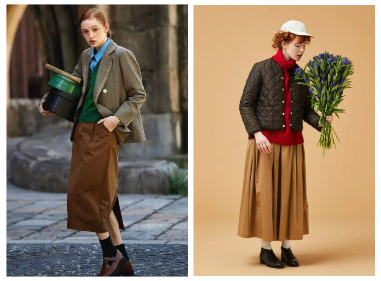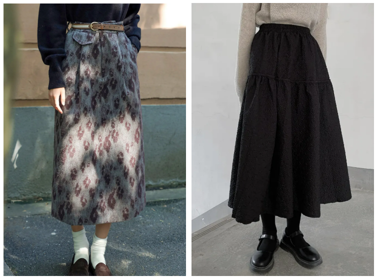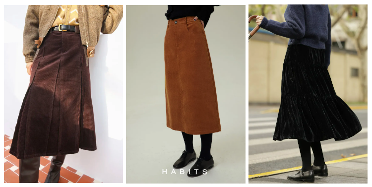 在款式上,灯芯绒肌理感更强,风格也更硬朗,建议选择中短长度的直筒或小A型的款式;丝绒呢则女人味更强,更柔美,适合中长的阔摆裙型。