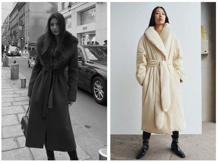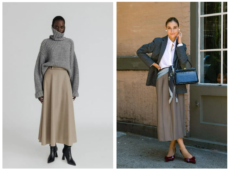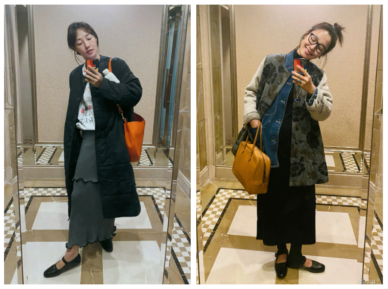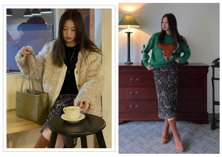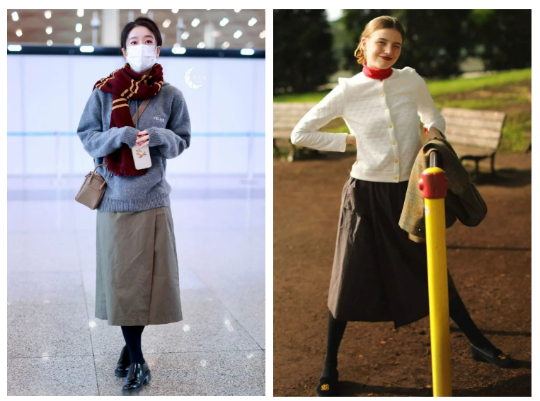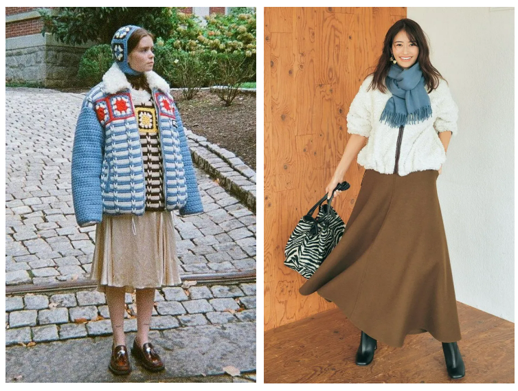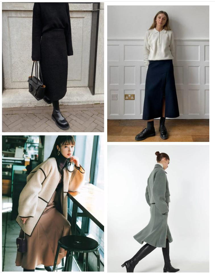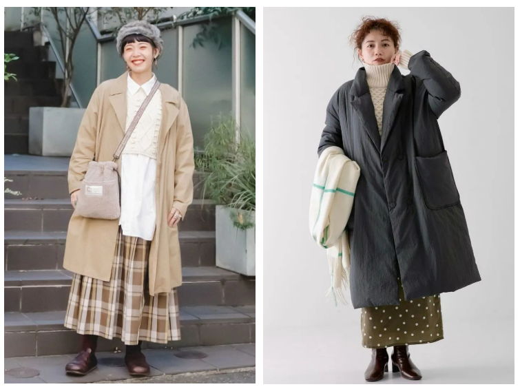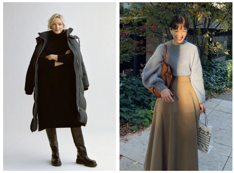 但进入深冬后,大家都换上了更厚实的羽绒服、大棉袄。而厚重型外套跟轻薄裙子组一起就不那么和谐了,再看看换成右图有重量感的温暖面料是不是就和谐很多: