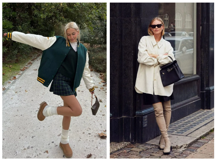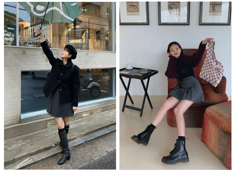 这组穿搭也同样适合小个子女生。不过比起左图相对复杂的绑带鞋、马丁靴,还是右边那种简单干练一点的靴型会更合适哦!
