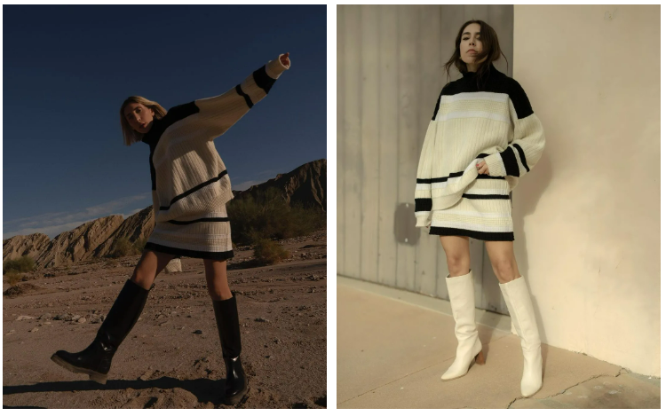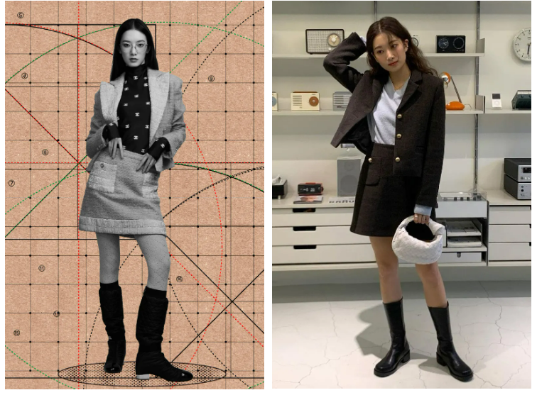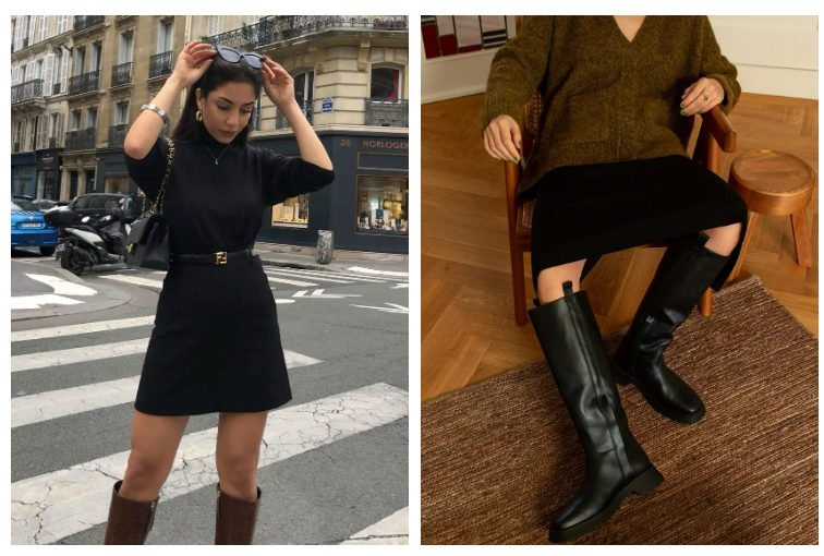 长靴怎么选呢?我更推荐偏紧身的靴筒。宽松的靴筒会在脚踝处有过多的堆叠量,碰上略长的裙摆,看起来就不太精神: