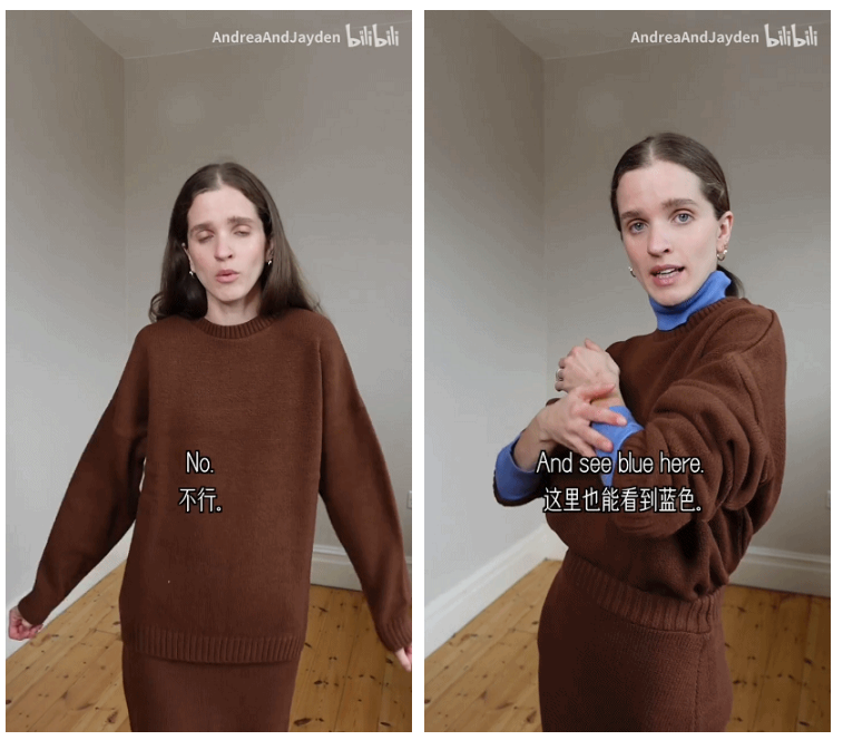 - 在配色上,她告诉我们蓝色和棕色是好朋友。棕色可以搭任何深浅的蓝。冬天穿纯色太无趣,就可以这样来点撞色。