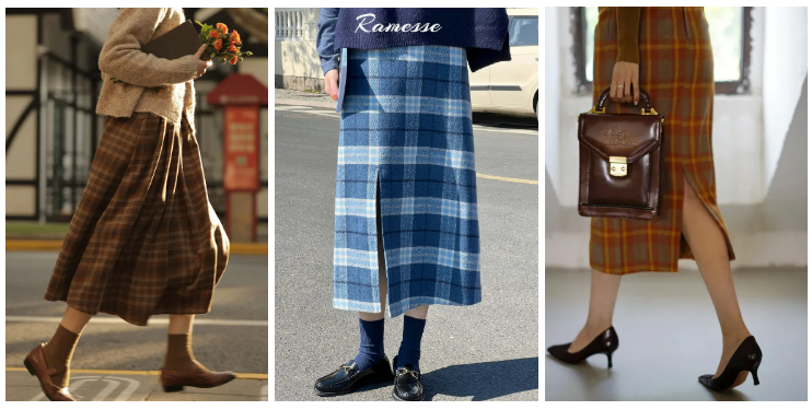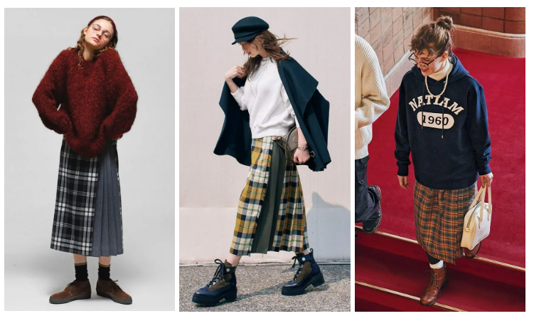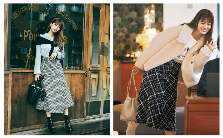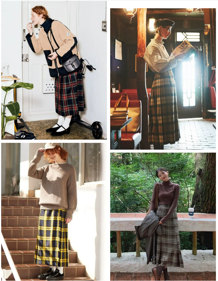 亮丽的格纹在冬天很醒目,搭配暗色系的上衣、外套正正好。款式呢基本都以宽松的大直筒或带点百褶效果的大摆裙为主,总归不能太紧身。这样的版型不会太挑身材,各种体型的妹子都可以试试看 。