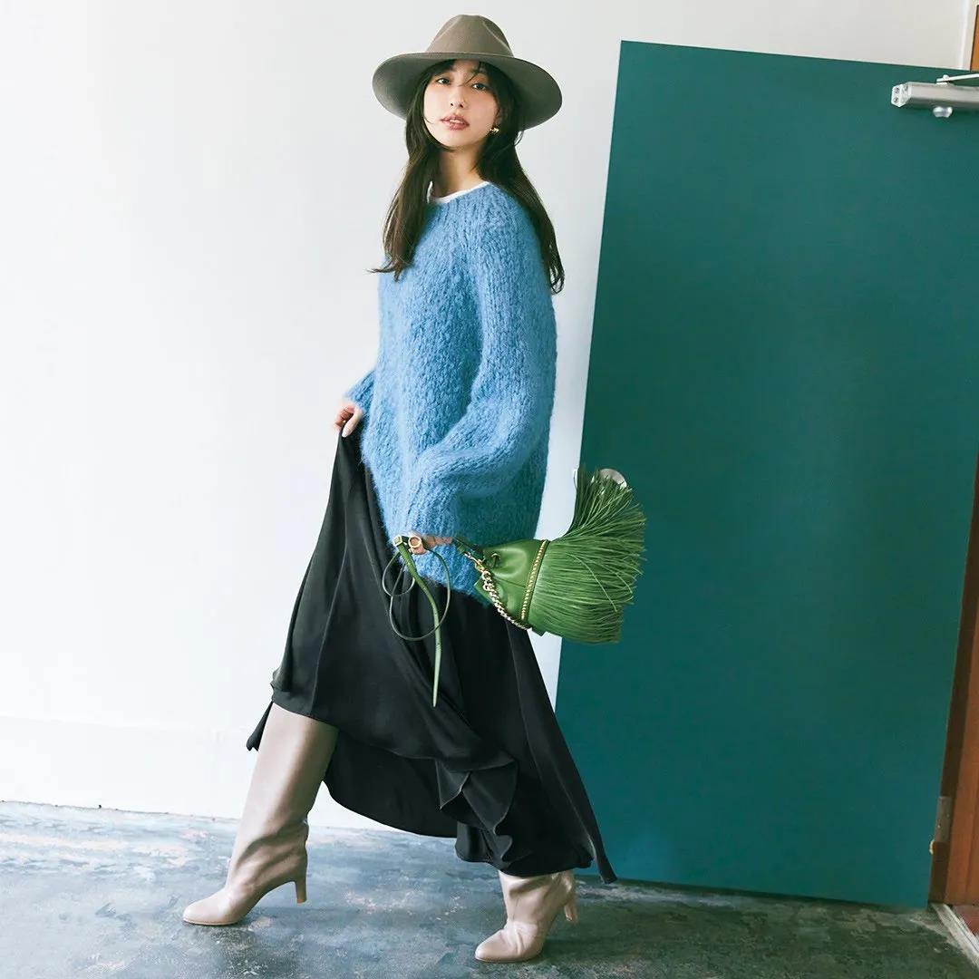 靴子和裙摆之间可以有条窄缝,整个下半身看着就很轻快。窄缝面积小,即便露出内搭的打底袜也不成问题。