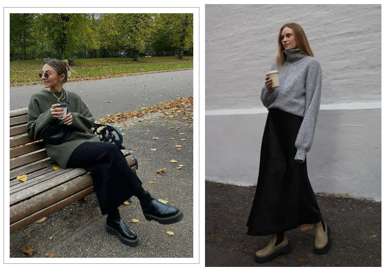 长及脚踝的长裙本身就有点笨重了,如果继续搭大长靴,尤其是有松量的靴型,会显得很累赘。