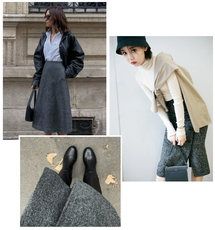 要论厚实程度,毛呢裙有话说!我个人很喜欢带肌理感的粗纺毛呢,自带高级感,属于在亲民价位也能买到好品质的那种!