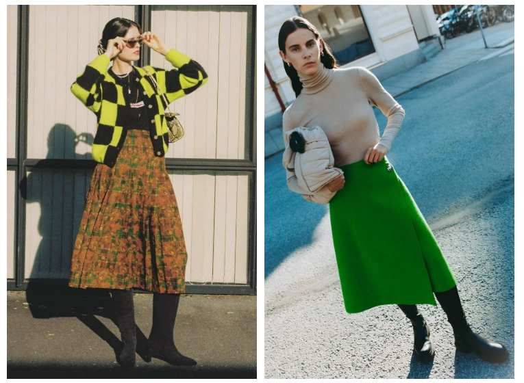 那冬天穿什么裙子更合适呢?其实在深秋、初冬时我会建议大家穿轻薄的雪纺裙来搭靴子,有反差的面料碰撞在一起效果很不错。配大衣、夹克、开衫都很好看。