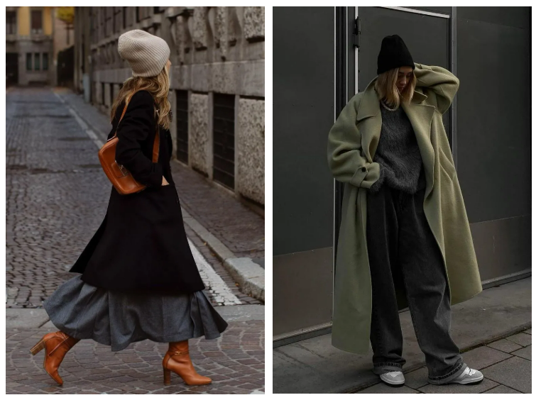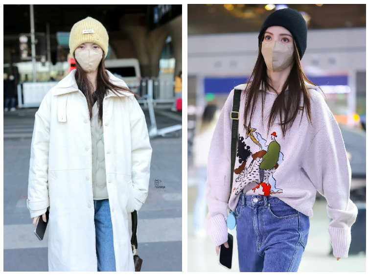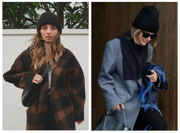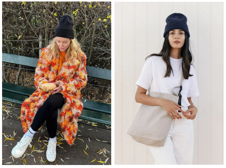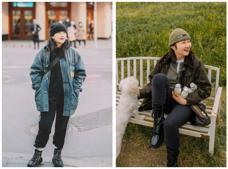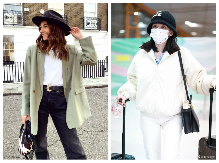 最关心的戴法和选品都搞定了,最后再来聊聊搭配。虽然这玩意百搭,但也有优次之分。同一位博主,类似的帽子,左边超时髦,右边就像是刚从被窝出来。