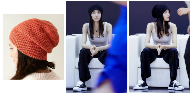 尤其是帽子大到在后脑勺处有赘量的款式,就更不能选厚的。换成像钟楚曦这样的薄款针织料会好很多: