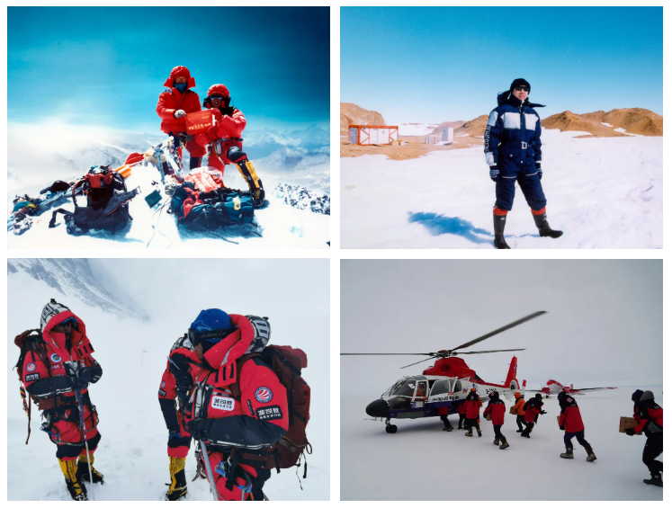 左下,1998年中国登山队次洛着波司登羽绒服登顶珠峰;