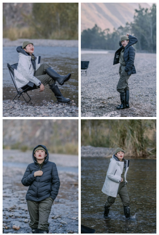 - 比如,在河边露营穿的专业户外羽绒服,一件可以拆成不同穿法,适应不同的天气变化。设计上呢,经典简约,合身设计不显臃肿,非常百搭,职场也完全可穿。