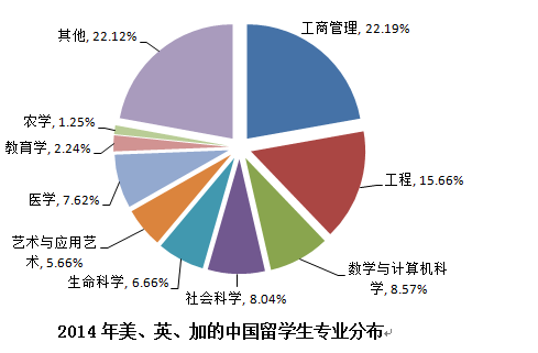 中国与全球化智库(CCG)编撰的国际人才蓝皮书《中国留学发展报告(2015)指出,中国留学生专业以商科、理工科为主,商科有所降温。