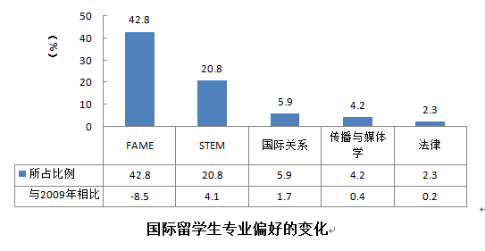 中国与全球化智库(CCG)编撰的国际人才蓝皮书《中国留学发展报告(2015)指出,FAME专业(金融、会计、管理、经济)和STEM专业(科学、技术、工程和数学)最受国际留学生的欢迎。主要因为这些专业的毕业生就业前景广阔、薪资丰厚。尤其是商科专业,近十年来一直是大部分国际留学生的首选。但根据QS在2013年的调查报告表明,相比于2009年,国际留学生对商科专业的偏好有多下降,减少了近9%,而其他如STEM专业,国际关系等却都有所上升。究其原因,主要受就业情况的影响。