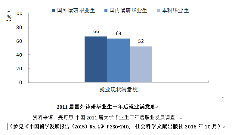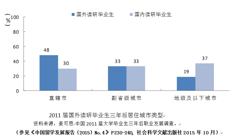 中国与全球化智库(CCG)编撰的国际人才蓝皮书《中国留学发展报告(2015)指出,留学人员回国现象逐年明显,约六成国外读研毕业生三年后已回国,回国后近五成居住于直辖市。回国的就业毕业生三年后的主要去向是工作、读研以及自主创业,其中自主创业的比例明显高于国内读研毕业生。就业的毕业生多就职于具有国际化特点及规模较大的企业。与国内读研毕业生相比,国外读研毕业生的就业质量更高。