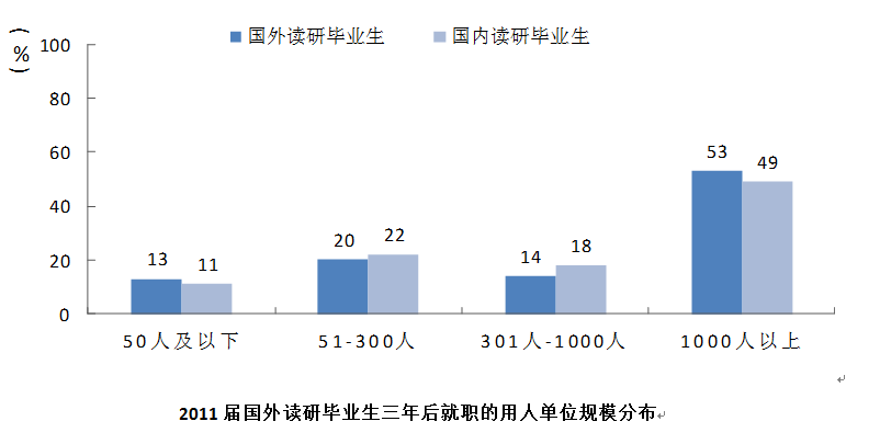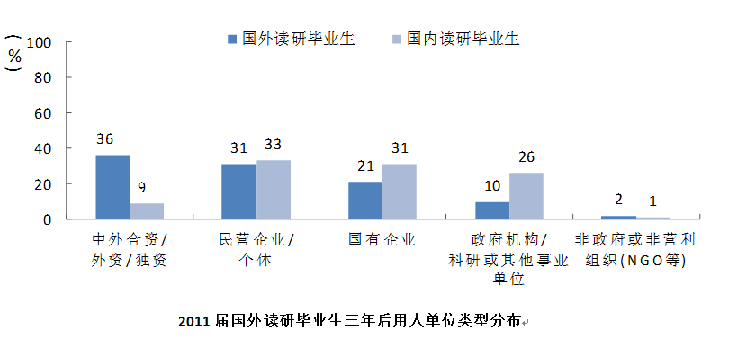 二是2011届国外读研毕业生三年后78%集中于工作,15.7%读研,工作的比例比同届国内读研毕业生的比例低,读研的比例比同届国内读研毕业生的比例略高;2011届国外读研毕业生自主创业的比例约是同届国内读研毕业生的3.3倍;2011届国外读研毕业生三年后有约四成就职于中外合资/外商/独资企业等具有国际化特点的企业,五成以上就职于1000人以上规模的大型企业。