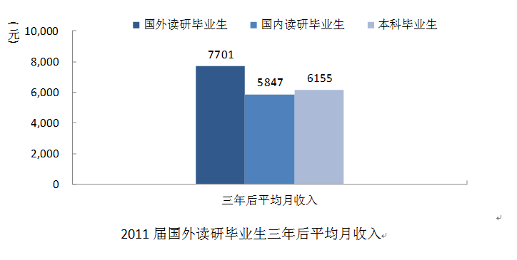 三是2011届国外读研毕业生三年后的就业质量高于同届国内读研毕业生;2011届国外读研毕业生三年后的月平均收入比同届国内读研毕业生高1854元;2011届国外读研毕业生的就业满意度高于同届国内读研毕业生和本科毕业生。综合看来,国外读研毕业生三年后在职场中的综合竞争力要高于同届国内读研毕业生。