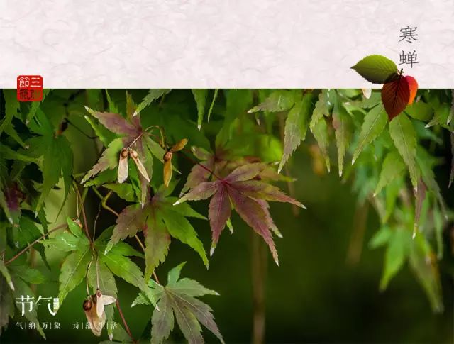 进入中秋,蝉感觉到树身变凉,再难引吭高歌。蝉出于泥土,日出前登高而蜕污秽之壳,饮风吸露,在树荫之间吟清素之声。此时寒蝉鸣声渐杳。待树身再凉,蝉就会坠于树下枯叶,重归泥土,“送尽行人又送秋”。