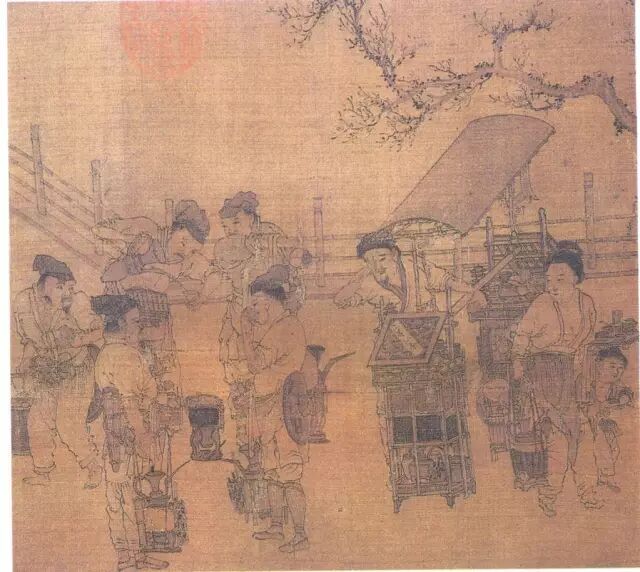 《茗园赌市图》一般被视为中国茶画史上最早反映民间斗茶的作品。在画卷描绘的集市左侧,有四个提着汤瓶的男子在斗茶,一位端着茶盏刚刚喝完似乎正在品茶,一位正要举盏喝茶,一位拿着汤瓶正在冲点茶汤,一位喝完茶正在用袖子擦拭嘴角。而在画面右边,一位男子站在茶担旁一手搭着茶担一手掩嘴似在吆喝卖茶,茶担里摆放着很多汤瓶与茶盏,茶担一头还贴着“上等江茶”的招贴。画面左右两边各有一个手拿汤瓶、茶盏等茶具的男女,边往前走,便回头看四位正在斗茶的人。画面中人物生动,器物细腻,俨然一派南宋市民卖茶、饮茶的生活图景。在刘松年的另外一幅《斗茶图》中,四位身背雨具、提着汤瓶、挑着茶担的卖茶者在市郊相遇,遂在松树下架炉煮水,品茶斗茶。