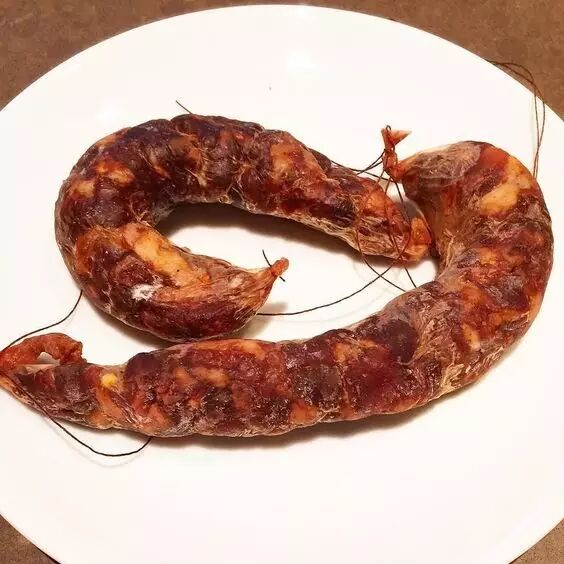 爸坐在长凳上一手匀速地转动绞肉机侧边的手柄,一手掌控着出口处肠衣的快慢移动,肠衣便像气球一样结实饱满的圆鼓了起来,光亮的表面透着内里满满胀胀红白相间的五花肉色。妈熟练接住肉肠逐段捏实压紧,麻利地以棉线分段打结,再用粗针在每节肉肠上戳孔放气。最后,再把这些肉肠挂在阳台的向阳方向,在家乡暖烘烘的冬阳和山风下晾晒个十天,让人食指大动的我家的香肠就大功告成了。