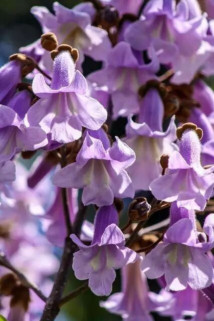 但是泡桐好像也不以为意,坦然地生在乡野,扎实地与乡民亲厚。每年春深,瞅着乡间玄参科的地黄开过后,它就会如期登场。在开花之前,枝头早已经有挂了一个季度的花蕾,泡桐的花蕾非常特别,一串一串土黄色的小球,开花之后,其花型像嘴唇一样,都是叠一大串累累地开。