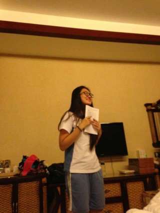 第一天晚上,我们就被唐岚学长"邀请"挨个练习朗诵,于利学长穿着橙红色的睡袍,声情并茂并且手舞足蹈,享受着《我是一条小河》,还虚心地接受我们的“卓越”,说:“是的,是的,我知道哪儿出错了,可是我不能停下来吖!”我们给她起了个爱称“于妈”