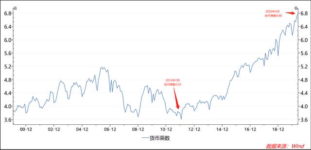 我们知道货币乘数的解释是:货币流转速度。同时,也代表着商业金融机构创造货币的能力。比如商业银行,它通过贷款变成存款、存款再变成贷款的方式派生货币。如果货币乘数为6.8倍,那就意味着,商业银行通过1元基础货币,派生出6.8元的派生货币。