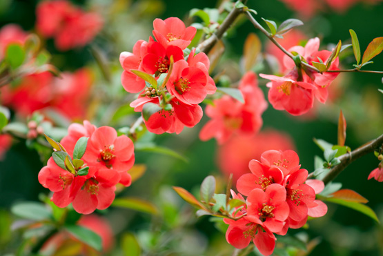 贴梗海棠,猩红色的花格外醒目。图片来源:shutterstock