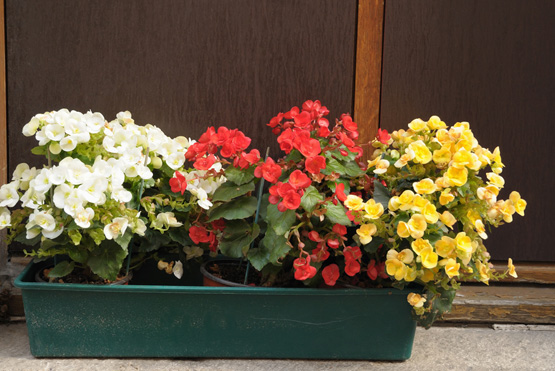 四季秋海棠(原产于巴西温暖潮湿的林间地带,在引出原产地后很长一段时间内都是作为一种多年生的温室盆花养殖的。在照顾得当的情况下,花期可长达大半年,显得一年四季都在开放,因此得名。随着养殖技术的进步和产量的增大,四季海棠已经能够走出温室,作为花坛布置、花柱装饰的花卉使用了。