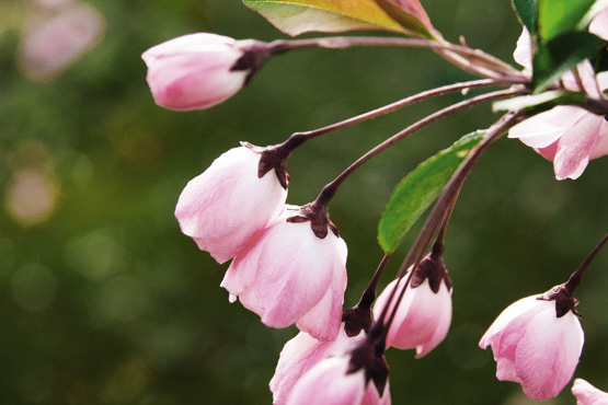 垂丝海棠(M. halliana)与西府海棠一样,同属苹果属。二者的花期接近,花色类似,粗粗看去很难加以区分。不过,垂丝海棠的花柄和萼片为紫色,而且花梗较长,花初开向上,及开则下垂,颇有慵懒之意。垂丝海棠怕旱而耐湿,在南方较为多见,一般多栽种在水边配景。烟花三月间漫步湖畔水岸,垂丝海棠花如胭脂而稍带粉白,团簇枝头,迎风轻荡,色韵皆美,构成一幅别致的江南春景。