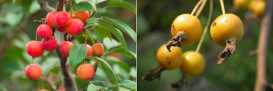 图2 左为西府海棠果实,样子很像小苹果;右为海棠花的果实,成熟后是黄色的。图片来源: