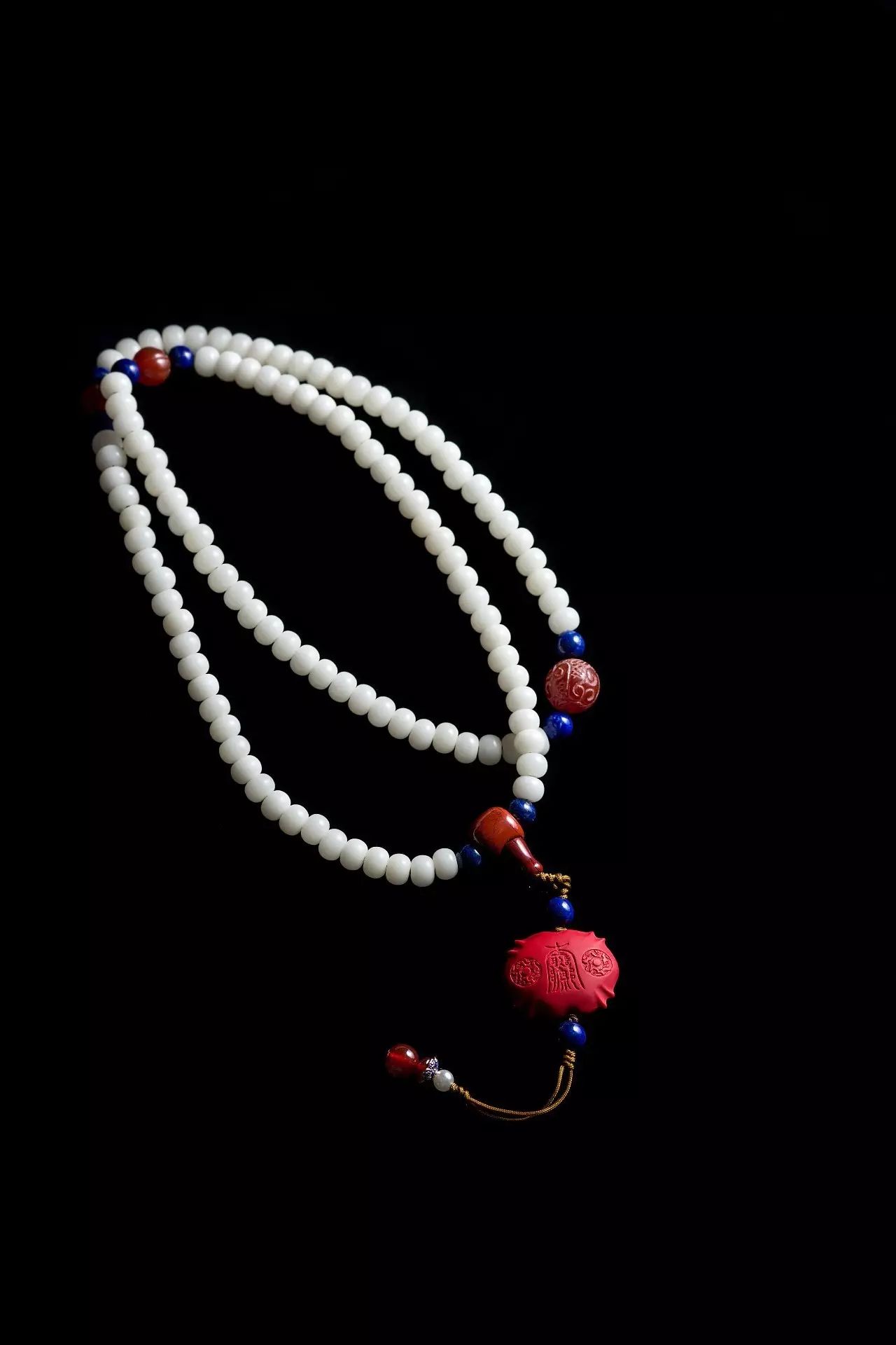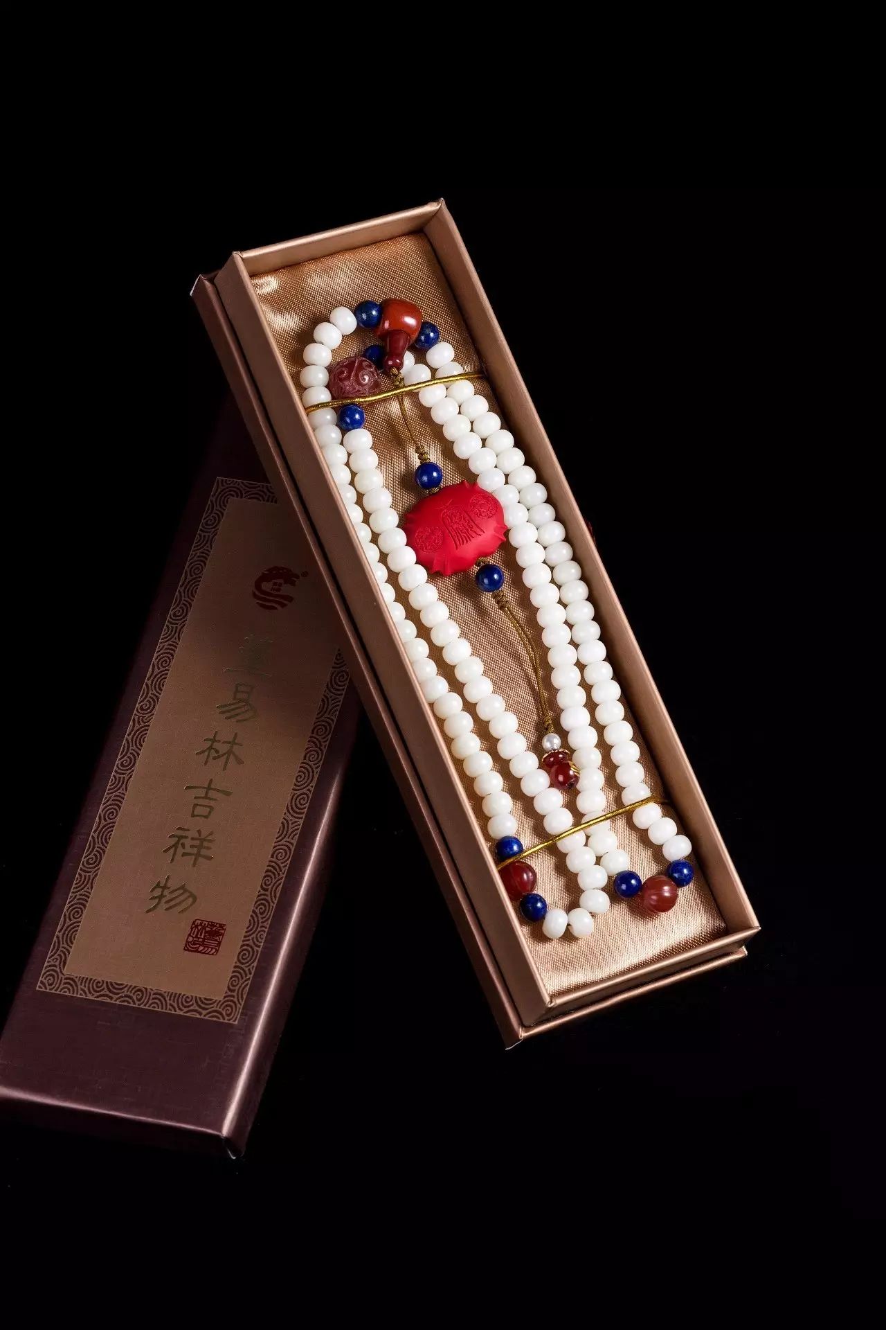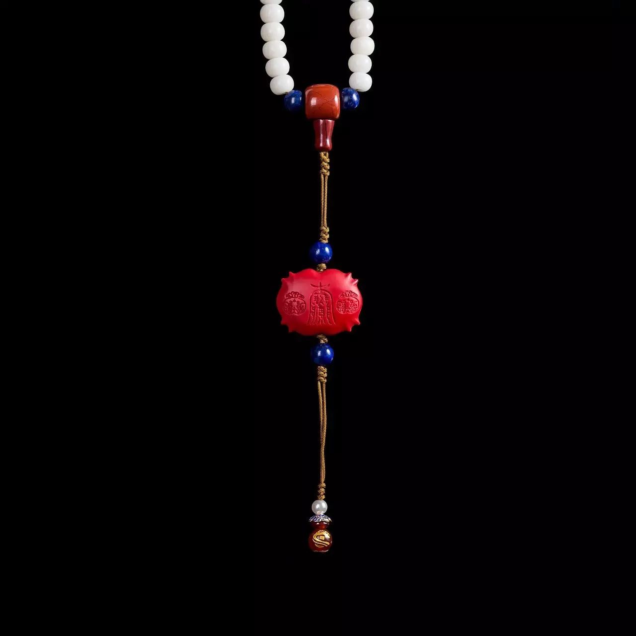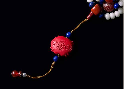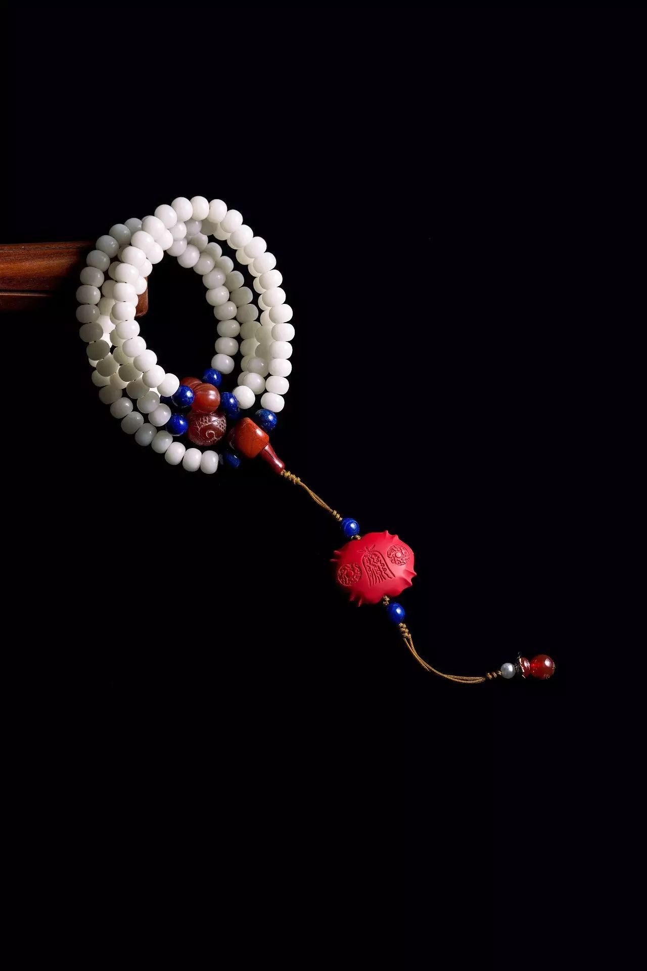 吉祥珠选用菩提根为主材、并加以红玛瑙、青金石、红纹石等精选材质,由技艺高超的匠人纯手工穿制,历经几十道工序。