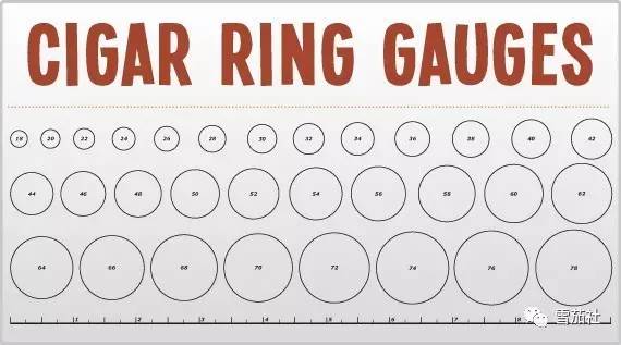 雪茄的尺寸通常是以1/64英寸(1英寸合2.54厘米)作为基本计量单位,用雪茄环径(ring gauge)来表示的。如果说雪茄的环径是49,则表明雪茄是49/64英寸粗,同样,雪茄的环径是64,则表明雪茄为1英寸粗,目前只有少数雪茄有这种尺寸,如多米尼加生产的9英寸上的皇家牙买加(Royal Jamaica)品牌的Goliath雪茄和具有相同长度、产自多米尼加的约瑟夫·贝尼托品牌的Magnum雪茄,其环径足有66那么粗。