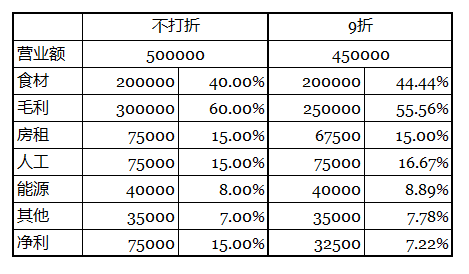 比如打个9折,看起来是营业额损失了10%,可是因为打折、打折多出来的营业额能够分摊掉房租这种固定成本,我表示很无奈,毕竟餐厅是您的,是您自己投资的,您说的算。