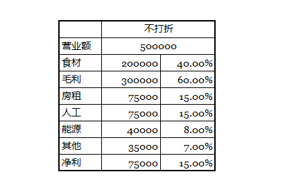 以一家月营收为50万的餐厅为案例,不打折的成本结构(损益表)如下: