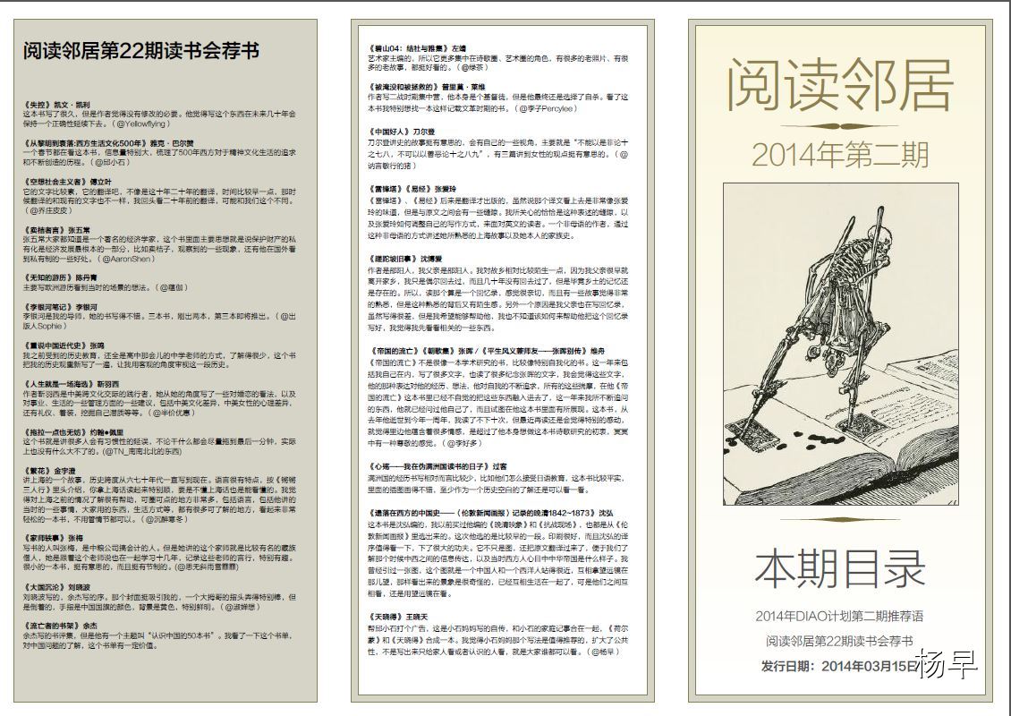 我和杨早、邱小石三人办阅读邻居读书会,转眼两年多了。目前我居家带娃,基本两耳不闻窗外事,例行参加的就只有读书会,及一些我们三个经常要碰面商量DIAO计划选书和读书会主题的事。