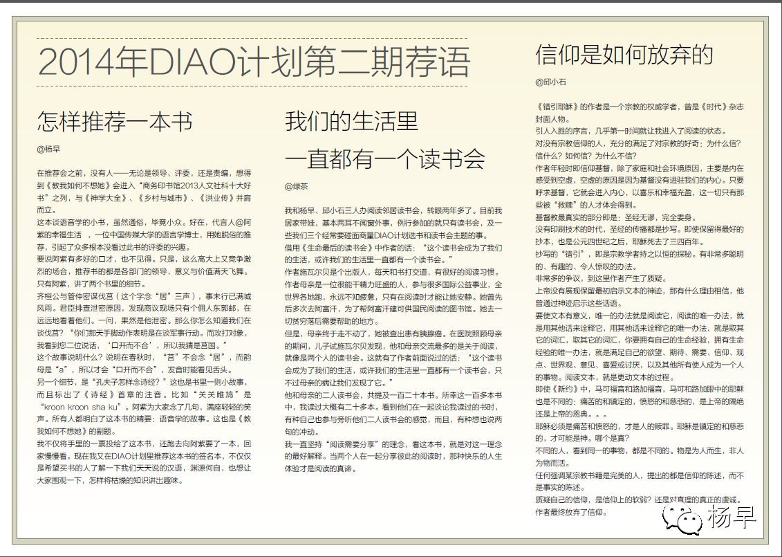 DIAO计划,是阅读邻居的三个发起人,邱小石、杨早和绿茶搞的一个有点类似“赌石”性质的读书活动。
