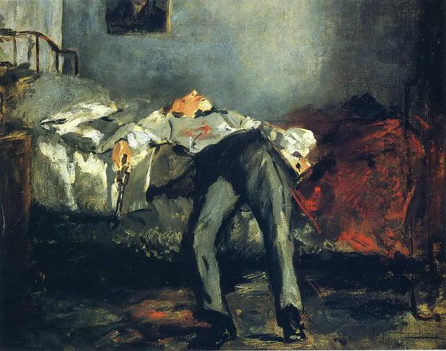 法国导演弗朗索瓦·欧容完成于2016年的翻拍电影《弗兰兹》,结束在影片的女主角安娜坐在巴黎卢浮宫展厅里的一条长凳上。彼时,德国姑娘正凝望着法国印象派画家马奈的画作《自杀》。马奈的这幅《自杀》,一点儿都没有他更为著名的作品《草地上的午餐》的气象。《草地上的午餐》,马奈让阳光透过树丛照射在坐在草地上午餐的男女模特儿身上,从而使得画面暖意十足。而《自杀》呢?白衣灰裤的男子躺在杂乱的床上,右手握着的枪和胸口的血迹呼应了这幅作品的题名。