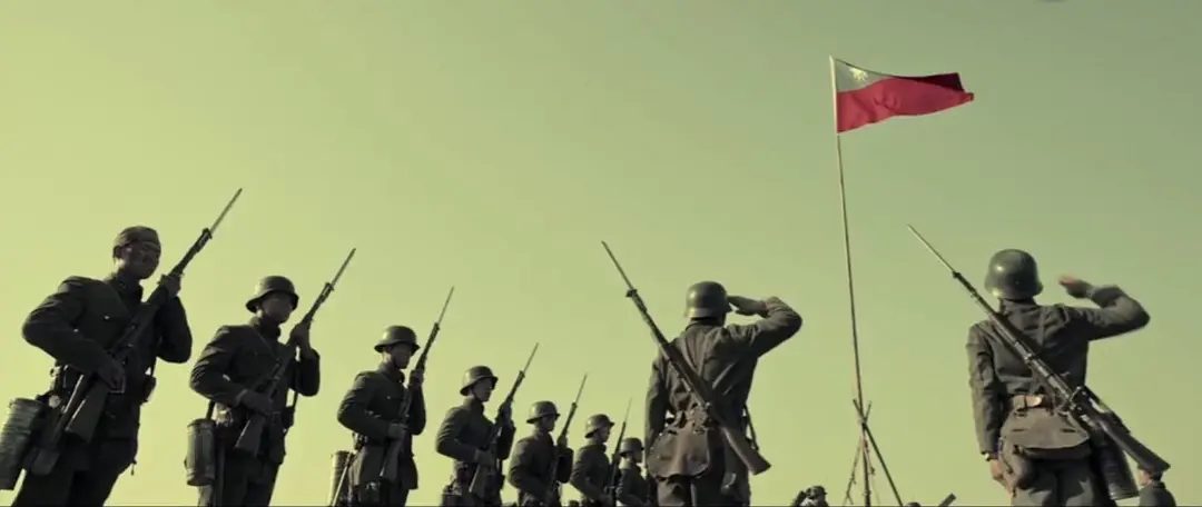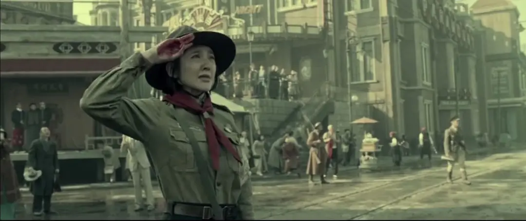 接过杨惠敏递给自己的旗帜,谢晋元团长的心里翻江倒海。主观上,他非常愿意看到这面旗帜飘扬在四行仓库的楼顶,就像消息稿所言,他想让这面旗帜"压倒四周之太阳旗,发扬我大中华民族之浩然之气"。然而,他也很明白,口出狂言要在3小时内拿下四行仓库的日本人,如意算盘碎了一地后此刻已经恼羞成怒,他们一旦看见这面旗帜高高飘扬,一定会撕毁所有纸面的和口头的协议,动用重型武器进攻四行仓库。谢晋元还是听从了内心。只是,气急败坏的日本人在看到高扬的旗帜后是怎么进攻四行仓库的,《申报》没有详细报道,通过大银幕,我们看到他们果然采用了最极端的进攻手段,想用最短的时间炸倒那面旗帜,而舍生忘死的壮士们,抱成一团死死地稳住旗杆。当然,肉体终究抵不过连珠炮般的射杀,但,一个人倒下了,更多的人冲上前去,最后,老兵油子羊拐一个箭步冲上前去,奋力擎住了那面旗帜……