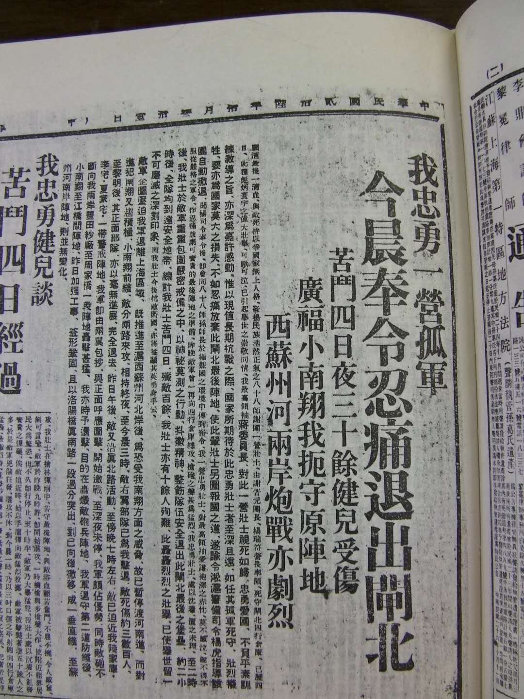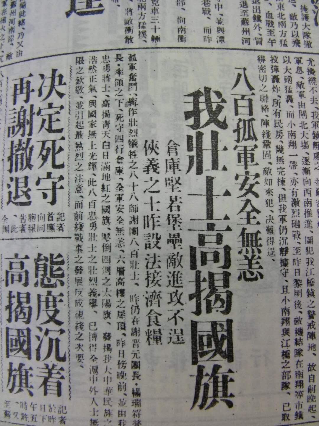 "孤军奋斗、宁作壮烈牺牲之八十八师谢团八百壮士,昨仍在谢晋元团长、杨瑞符营长率领下,死守四行仓库,全军安全无恙,六层高楼之屋顶,昨日傍晚前,由我忠勇将士,高揭青天白日满地红之国旗,压倒四周之太阳旗,发扬我大中华民族之浩然正气,与国家无上光辉。此八百忠勇壮士之壮烈义举,已搏得全沪中外人士无限之钦佩,并引起最热烈之注意,而前线战事日之发展反成视线之次要。"
