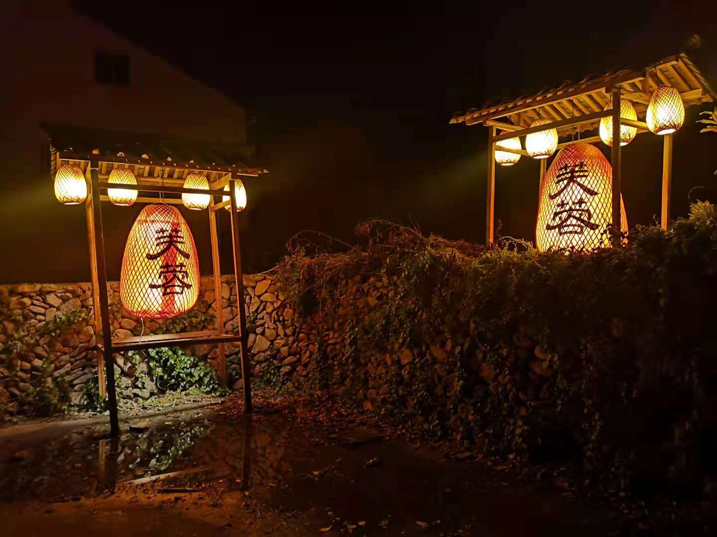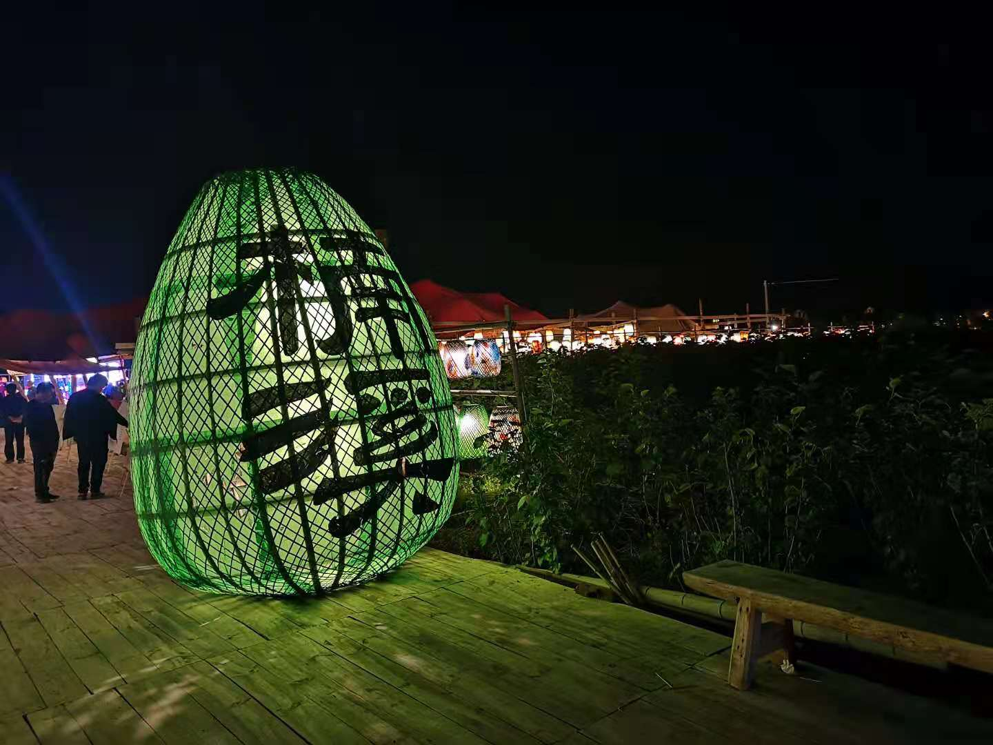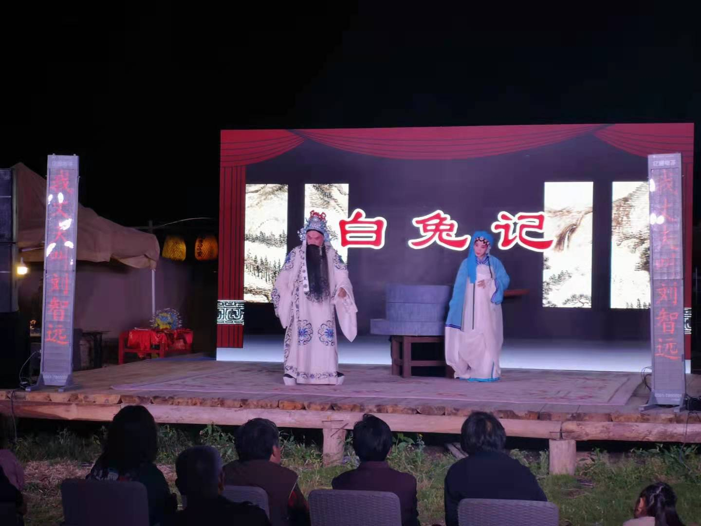 在街边小饭店吃了晚饭离开时,被饭店门口闲聊的当地人强烈安利了灯会。同行的老王老张夫妇坚持回去休息,而我们,在路口犹豫了犹豫,决定还是去看看小镇的灯会究竟怎样。顺着被指点的方向走过去,前方黑洞洞的哪里有灯会的意思?正要失望而归,左侧的树林里影影绰绰地闪着灯火,便寻光而去,果然,那就是岩头镇的灯会。灯会的规模不大,灯火下有一些小吃摊。也许我们来得太迟了?小吃摊里难见几位吃客。倒是临时搭建的舞台旁观众席里,坐着不少安静看戏的人。我侧耳听去,昆剧吗?便也坐下看起戏来。目测有20位琴师组成的伴奏乐队烘托下,盛装的演员正在演出《白兔记》。只知道《白兔记》出现于元代,是谁的作品?写戏人的姓名已经淹没在历史的长河里,如今文本标注的作者为永嘉书会才人,这就不难理解《白兔记》何以成为永康昆剧团的保留剧目了。看着舞台上的男女演员一板一眼地唱着五代后汉的开国皇帝刘志远与李三娘悲欢离合的故事,思绪不由得回到元代:月朗星稀的夜晚,楠溪江畔的农人忙碌了一天一月一年后,也追剧,就像今天一样,几点火光映照下,《白兔记》、《荆钗记》、《杀狗记》、《拜月亭记》等”四大南戏“在乡野舞台上你方唱罢我登场。
