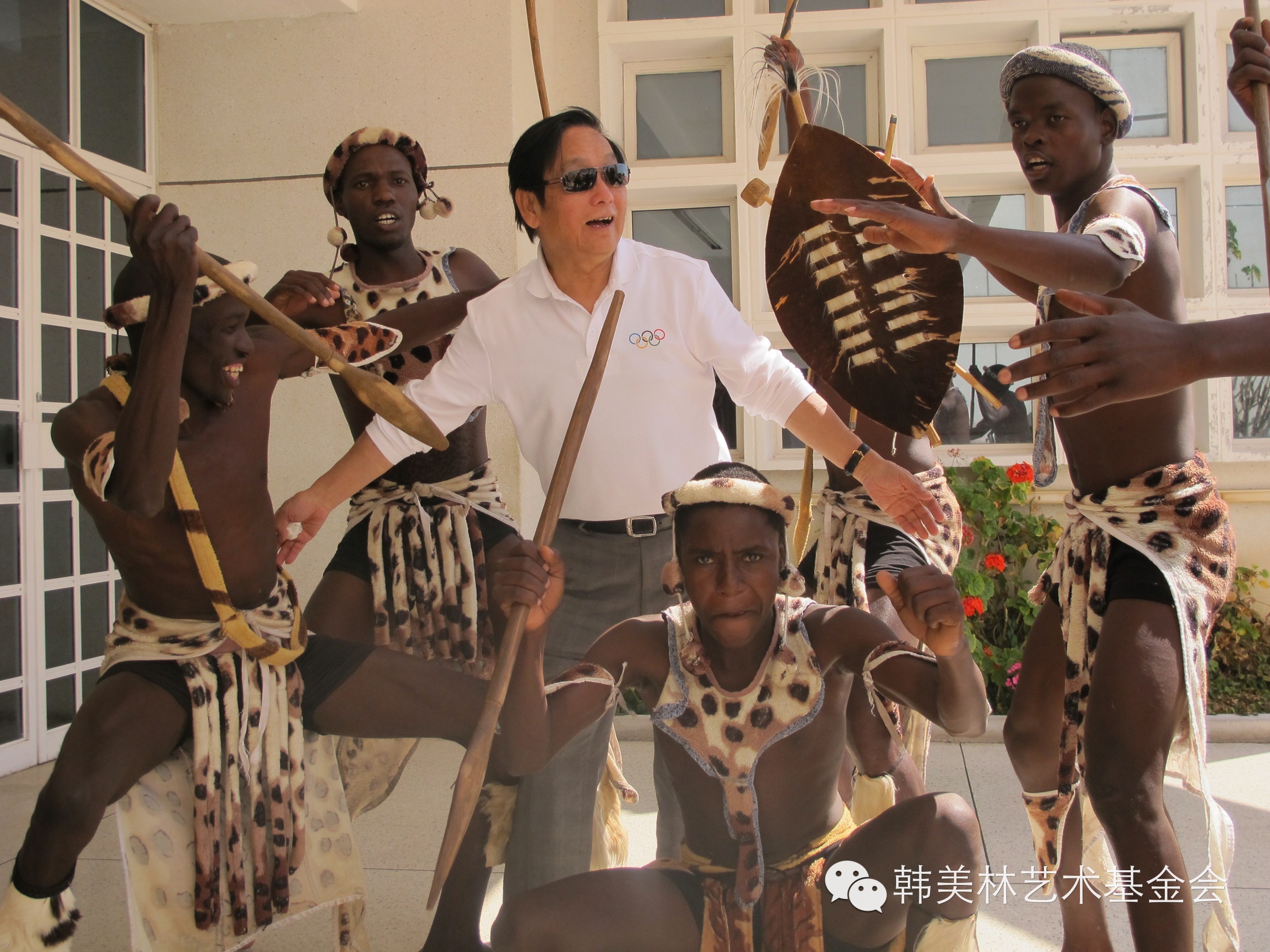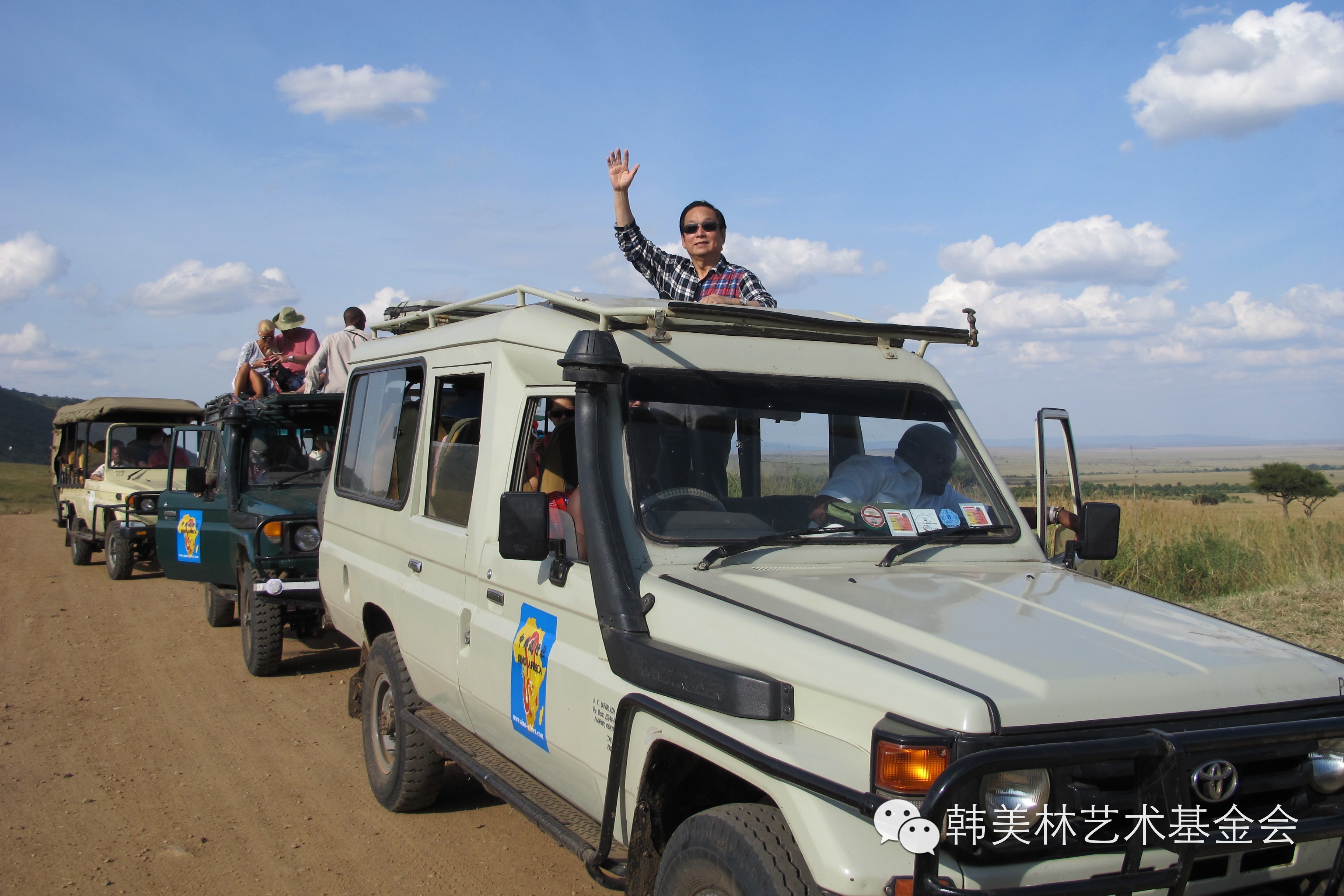 现代化通讯设备为我们这些猎奇者提供了很大的便利,非洲导游手中的雷达时刻告诉着我们,哪个方位有我们感兴趣的动物、哪个方位有我们感兴趣的奇观。一天下午,天气出奇地好,导游告诉我们在草原的东西方向有一只母豹带着小豹正在猎食,于是我们悄然而去在一望无际的草原上,我们突然看到一只鹤立鸡群、身材健硕的非洲豹肃静地立在一个高高的白蚁窝上审视着周围,我们慢慢地靠近它。当我缓缓举起相机准备拍摄时,只听到咚地一声,豹子消失了——正当我左顾右盼地开始寻觅时,美林捅了我一下并朝车顶挤了挤眼,天哪!虎视眈眈的猎豹就在我们的头顶上!该死的马赛马拉,那里改装后的吉普车的天窗没有一个盖得上的,但谁知道我们会“中奖”呢?豹子骄傲地横跨着天窗,将周围几辆吉普车上的游客吓了个半死,而我们就在它的眼皮子下,看到的是它鼓鼓的、白色带金钱纹路的肚皮,它要是下来了,那我们一定是它的一顿美餐。我想到了死无完尸的后果——不知道为何?此时的我觉得自己应该记录下这一切,要对后人有一个交代。我曾口口声声在大庭广众面前说要照顾好、保护好韩美林,如今即将在非洲草原上食言,想到这几年来的努力即将化为乌有,不知哪里来的勇气,我镇定地将手机从照相模式调到摄影模式,举起手来抬头对着猎豹。此时,我看到美林也同时举着相机镇定自若地对着豹在拍摄。俗话说:“吃了豹子胆了”?是的,当时的我们就是吃了豹子胆了!