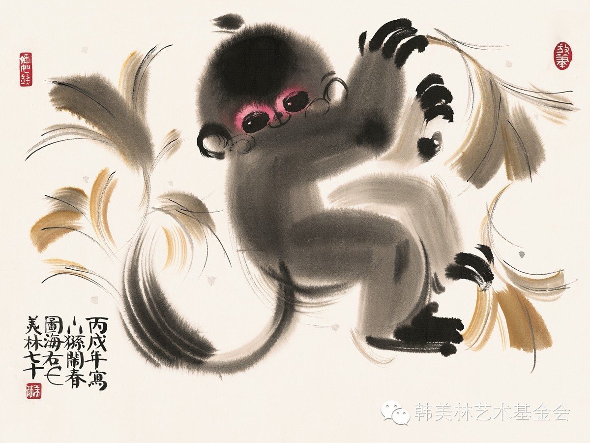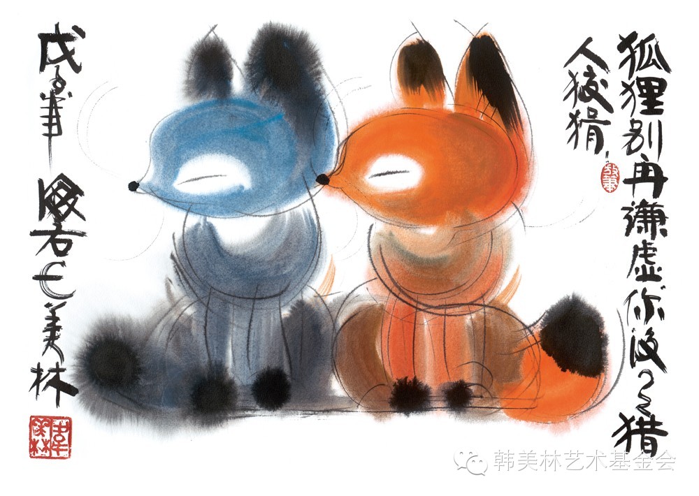 从上世纪八十年代创作的毛茸茸动物水墨画开始,韩美林的动物画呈现世人。他笔下的动物,萌态、媚态、憨态,栩栩如生:有活泼俏皮的狐狸,有憨厚可掬的小熊猫,有乖巧机敏的兔子,有飘逸潇洒的马,等等。