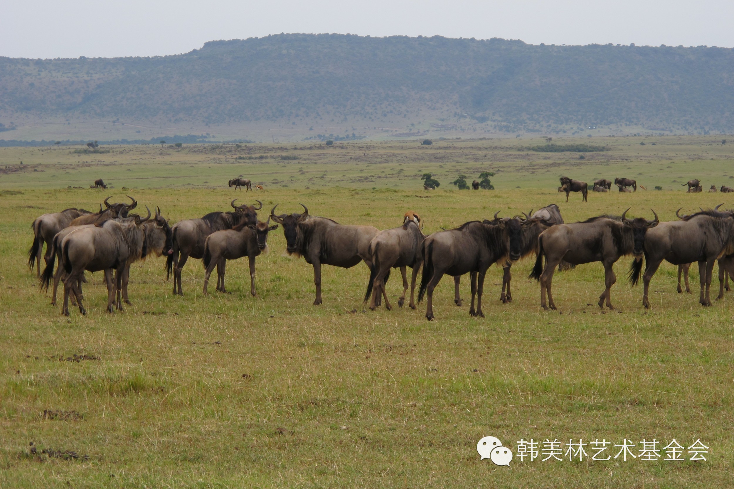 车驰骋在广袤的马赛马拉大草原上,大迁徙的大戏于前几日刚刚拉开帷幕。迁徙大军以角马为主力部队,以斑马为先遣部队,大象为“辎重”部队,其它草食动物为配援部队,有序而热烈地进行着。它们如铁流滚滚,没有什么力量能阻挡它们前进的步伐。我们的身心被大自然融化了!满身尘土的我们,更像无畏的战士,没有人可以动摇我们的意志。一路上我们不停地与狮子、跳羚、大象、长颈鹿、斑马、小鸟等招手致意,这里是世界上动物最集中的栖息地,非洲最多姿多彩的草原,人和动物最和平共处地方。无意中,前方出现一辆吉普车,交汇时看到天窗上站着一个戴着墨镜和草帽、露着脏脸的男人,那不是央视的张子扬吗?我们犹如狭路相逢般地打了一个招呼后瞬间消失在尘土中。随后想起这件事,我便心有余悸地恍若在梦里,直到晚上手机中收到子杨的一首诗,才渐渐释怀: