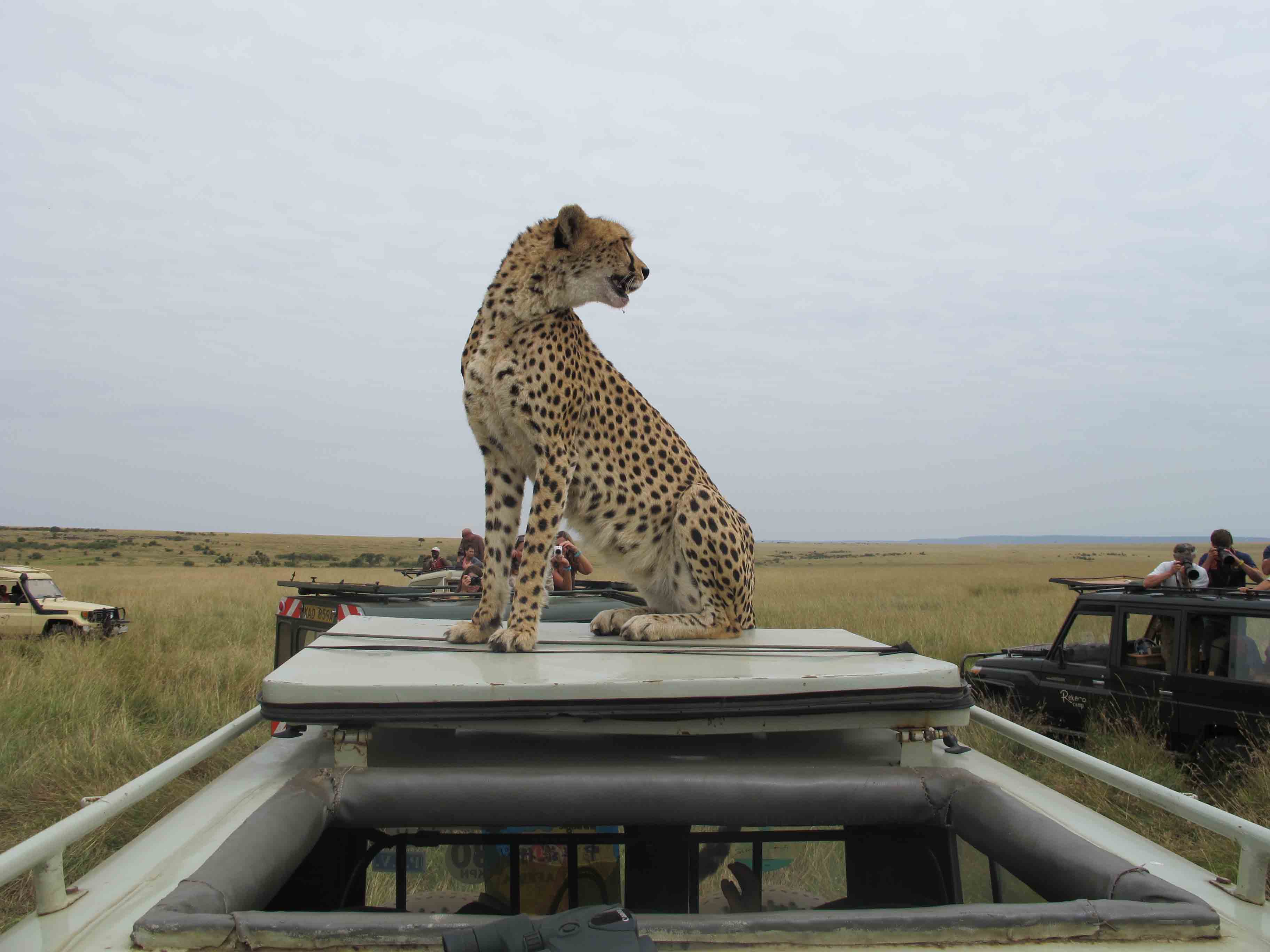 第二天我们凌晨四点起床,经历了缺电伸手不见五指摸索着整理行装的尴尬及在悬崖峭壁上飞鹰走俏的险境,也干过坐着热气球追逐动物的爽事,更遭遇过狮子们横在马路中间审视着车窗里我们的恐怖——然而,值得我们怀念和豪迈的,莫过于猎豹跳上我们开着天窗的车顶准备下来与我们共舞的壮烈场面——