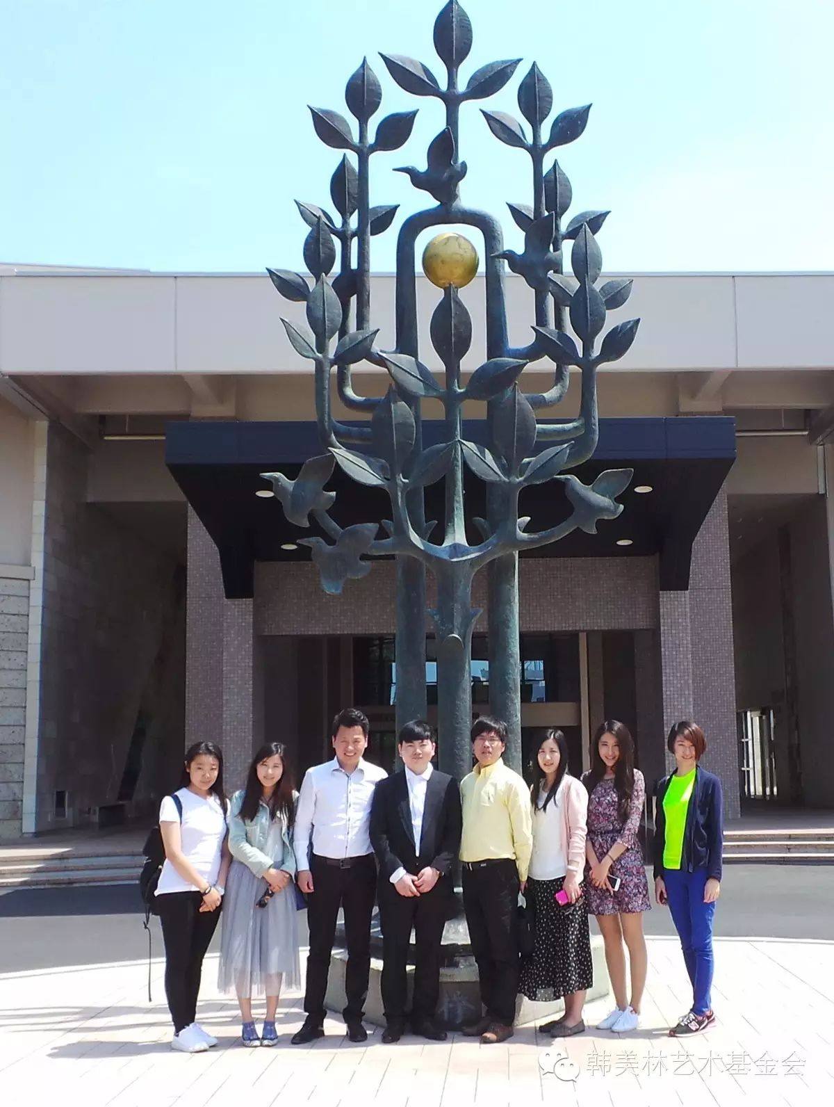在真冈市韩美林雕塑《榉》前合影