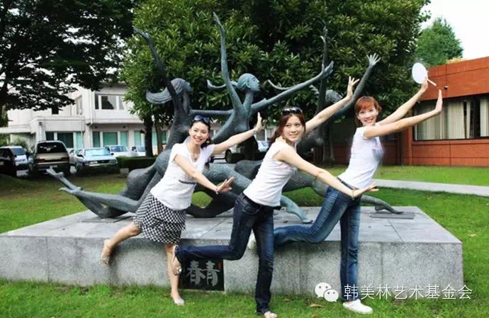 在真冈市韩美林雕塑《青春》前合影