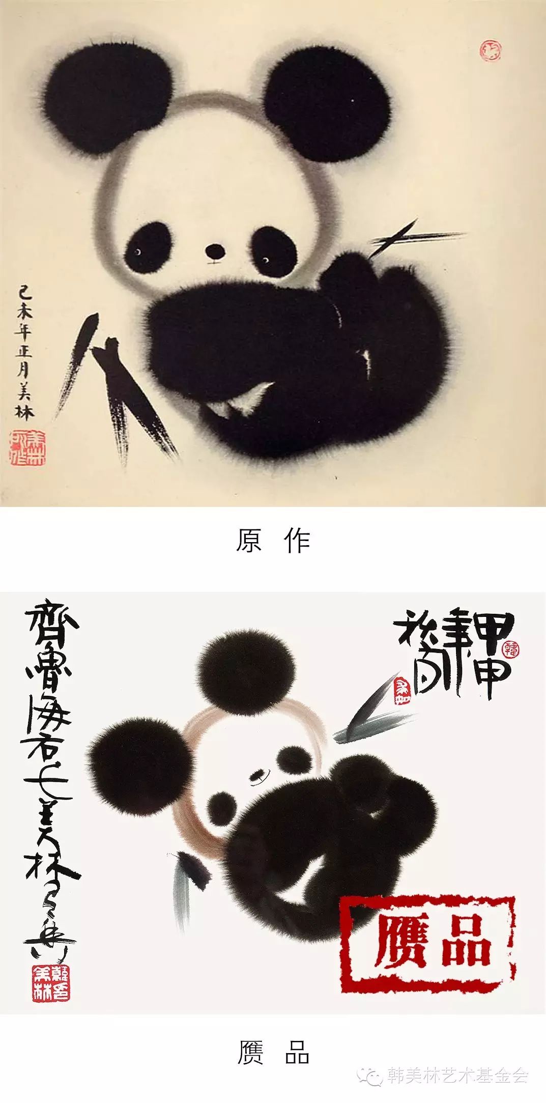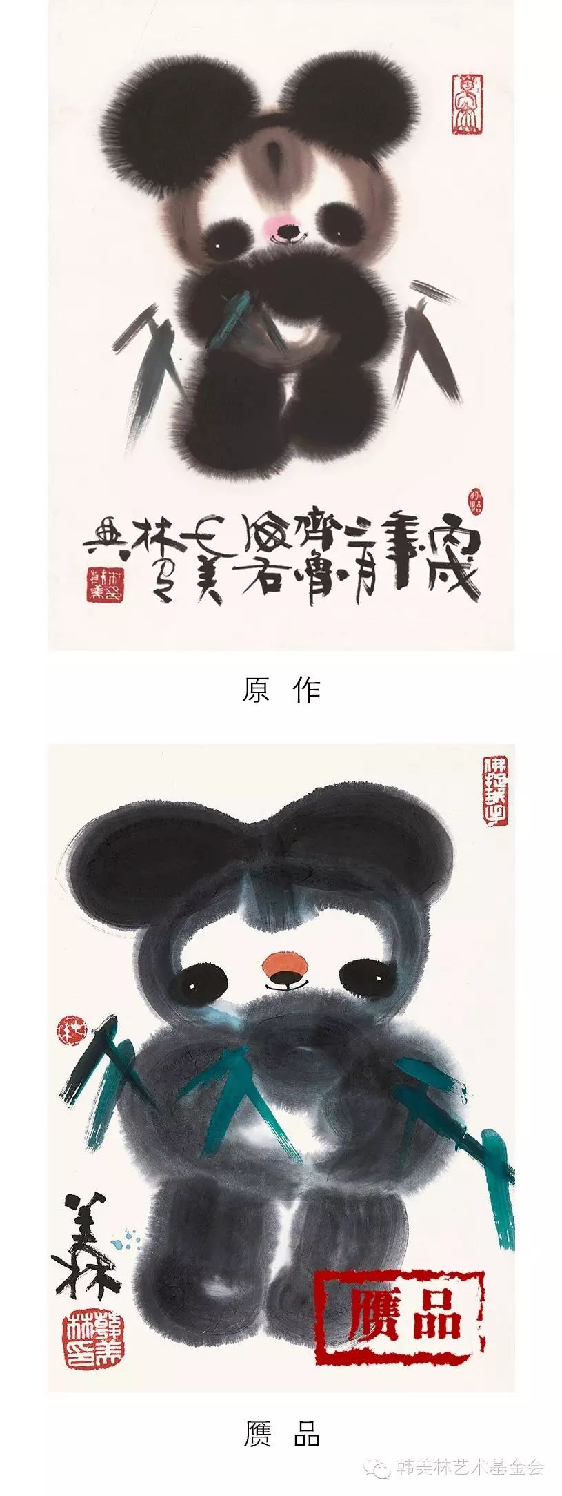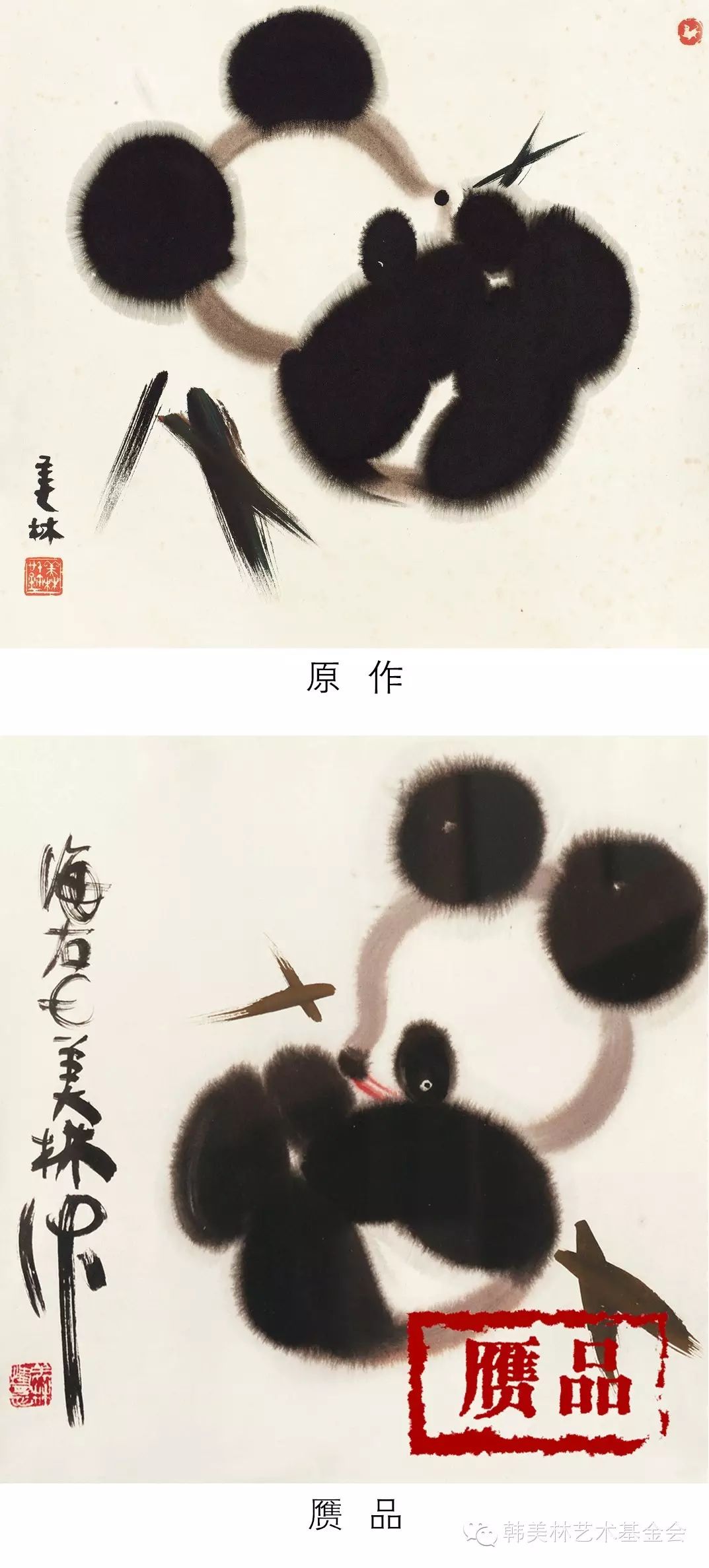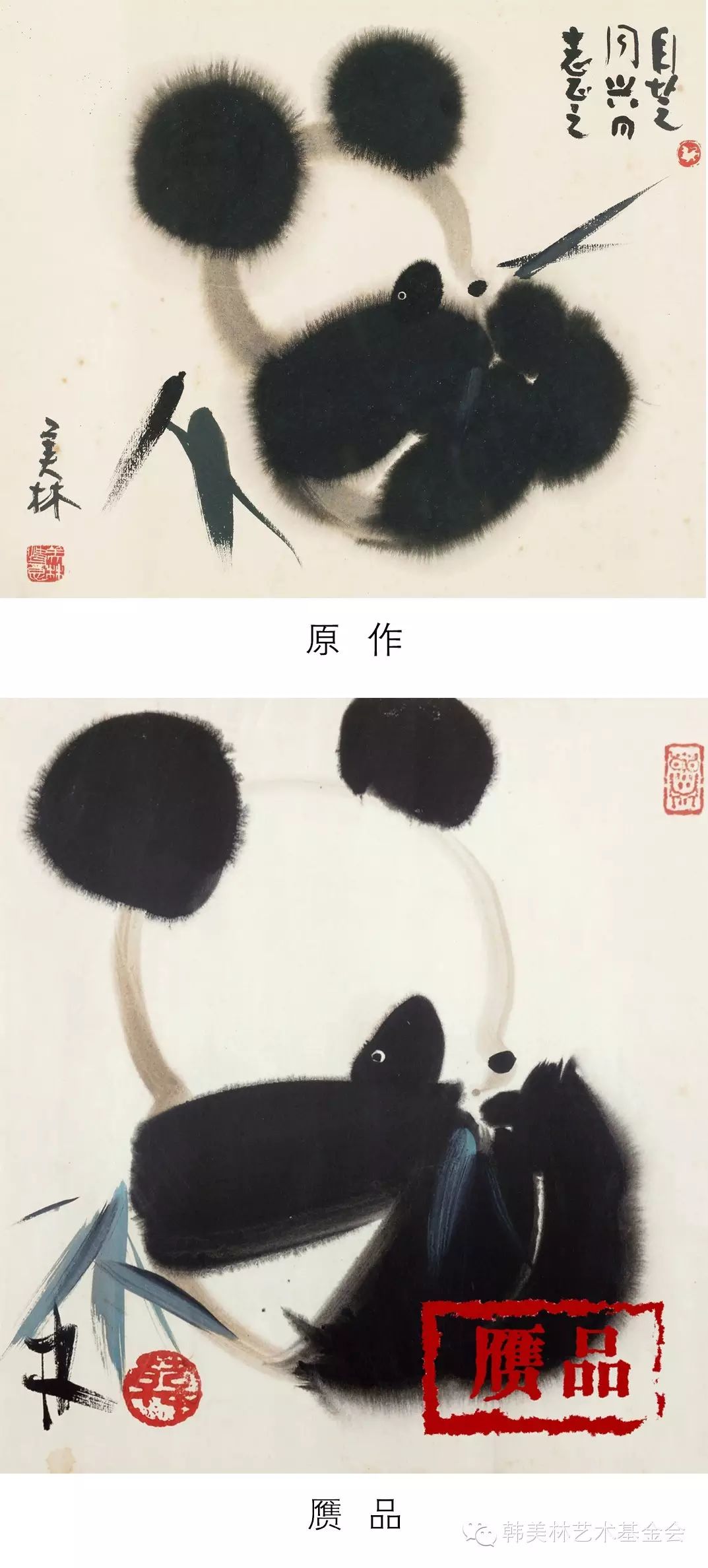 2015年7月3日,微信公众号“艺术书画研究院”发布了《中国8大国画巨匠的顶尖之作》一文,文中最后涉及到韩美林的两幅熊猫画作。经韩美林本人鉴定,其中一幅为赝品。为了正本清源,今日转载此文,将赝品图更换为真作图,并附部分韩美林熊猫画作真假对比图,以供读者参考。