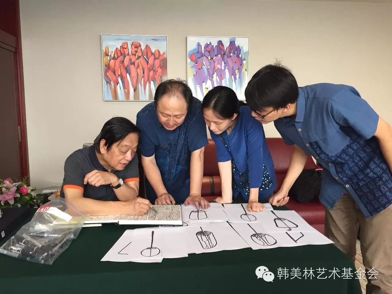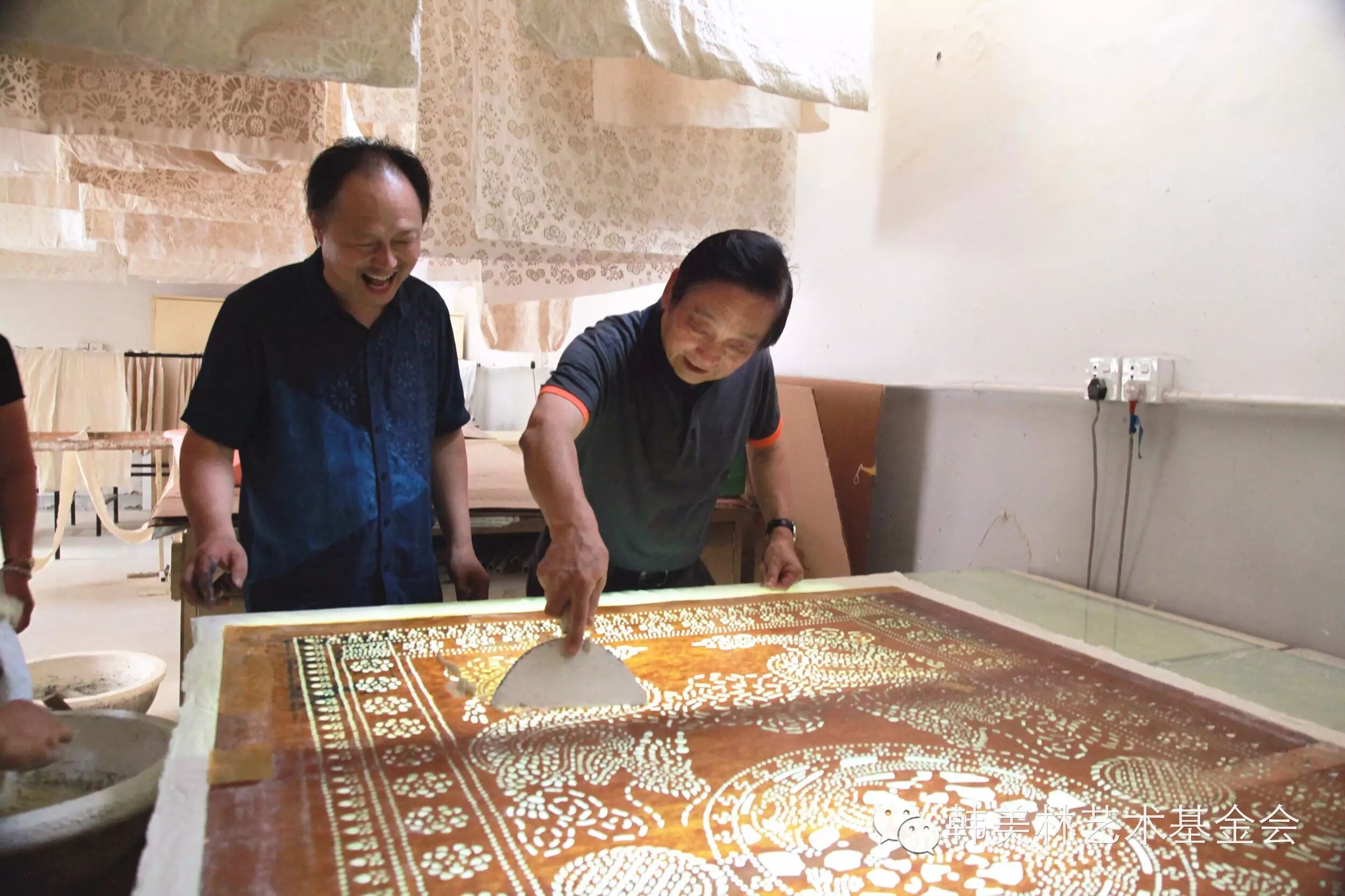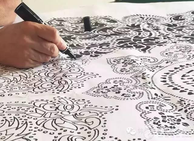 2015年8月26日-27日,为了筹备韩美林艺术馆(银川)的开馆作品,“韩美林艺术大篷车”离开宜兴,来到了南通蓝印花布博物馆。在馆长吴元新的陪同下,韩美林、周建萍夫妇认真翻阅了馆内珍藏的五千多件明清以来的蓝印花布实物、图片资料以及相关的传统印染工艺藏品纹样,随后又来到制作车间,亲自试验刻板、刮浆。